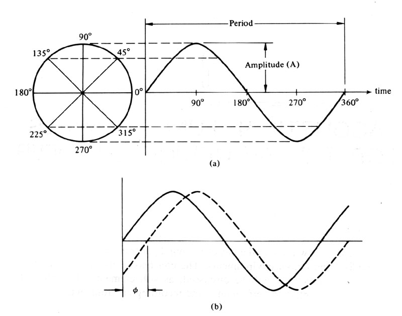 Generation fo a sine wave (a) showing amplitude and period, (b) phase relationship between two sine waves of the same frequency, from