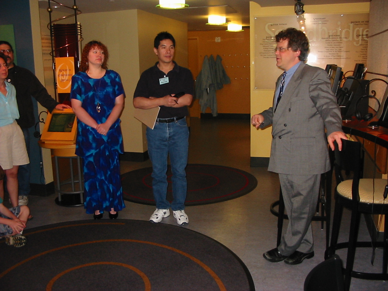 Bryan Stratton, Soundbridge Manager (in suit), explains a kiosk to attendees