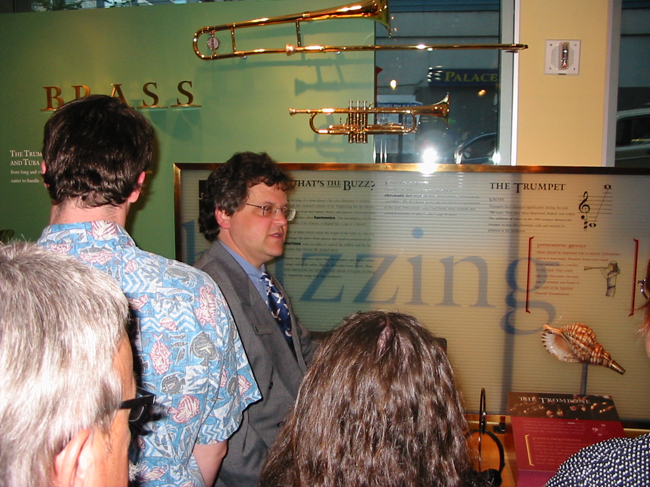 Bryan Stratton, Soundbridge Manager (in suit), explains brass instrument display to attendees