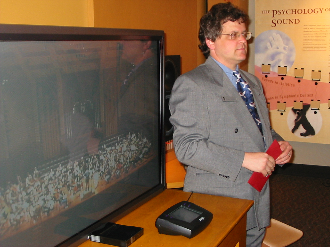 Bryan Stratton, Soundbridge Manager, shows the Seattle Symphony in rehearsal upstairs to AES attendees on closed circuit plasma TV.