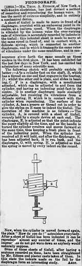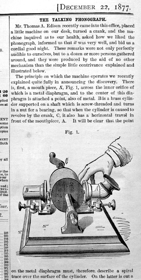 article on tinfoil phonograph, from Scientific American, Dec. 22, 1877