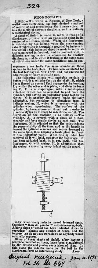 article on Edison phonograph, from English Mechanic, Jan. 6, 1878