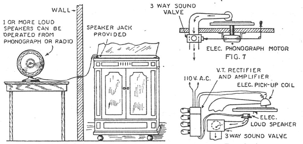 Illustration 2 - Fig. 6 shows that several loud speakers can be used with this new combination phonograph and radio set so as to reproduce the sound in any part of the house. Fig. 7 shows operation with standard phonograph reproducer and Fig. 8, with electric pick-up through amplifier and to loud speaker, result being tremendous volume.