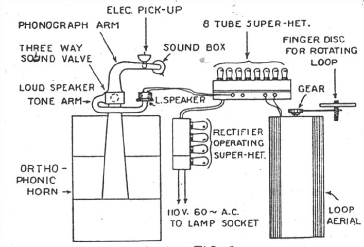 The greatly amplified voice currents coming out of the amplifier are passed into a new orthophonic loud speaker which embodies all of the qualities of the new sound box, in that it can cover 51/2 octaves of sound and will not blast or distort any of the notes. This loud speaker is also used in connection with the eight tube Super- Heterodyne built into the cabinet as the photographs show, the loop aerial for which is enclosed in the cabinet also, the loop being rotated by a disk or dial mounted in the instrument shelf at the top of the cabinet.