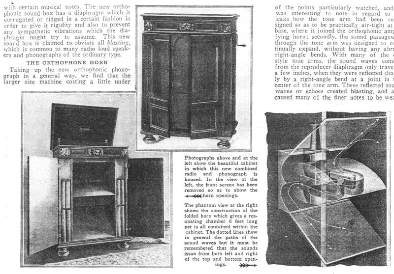 One of the men familiar with the experiments carried on in the laboratory in developing the new orthophonic horn said that while a six foot horn might seem long to the layman, the ultimate in sound reproduction would be obtained by means of a horn twenty feet in length. One of these days we probably will be buying phonographs with twenty feet of horn folded or spirally concentrated within its case, but the phonograph experts tell us that the new six foot horn reproduces and builds up practically all of the main vibrations over the 5-1/2 octave scale, so necessary for first-class vocal and instrumental sound reproduction.
