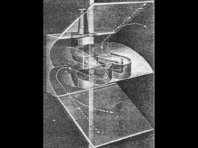 Illustration 5 - The phantom view at the right shows the construction of the folded horn which gives a resonating chamber 6 feet long yet is all contained within the cabinet. The dotted lines show in general the paths of the sound waves but it must be remembered that the sounds issue from both left and right of the top and bottom openings.