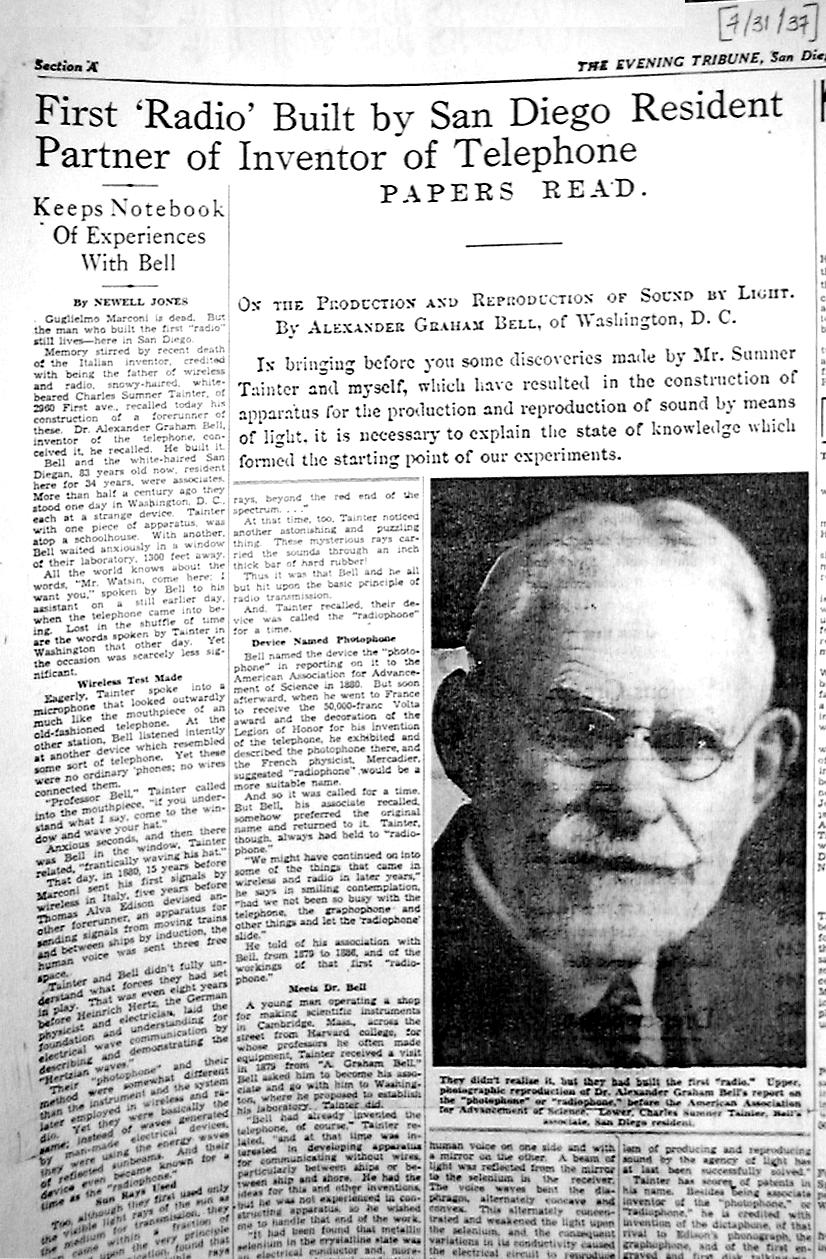Bell and the white-haired San Diegan, 83 years old now, resident here for 34 years, were associates. More than half a century ago they stood one day in Washington, D. C., each at a strange device. Tainter with one piece of apparatus, was atop a schoolhouse. With another, Bell waited anxiously in a window of their laboratory, 1300 feet away. All the world knows about the words, "Mr. Watson, come here; I want you," spoken by Bell to his assistant on a still earlier day, when the telephone came into being. Lost in the shuffle of time are words spoken by Tainter in Washington that other day. Yet the occasion was scarcely less significant. Eagerly, Tainter spoke into a microphone that looked outwardly much like the mouthpiece of an old-fashioned telephone. At the other station, Bell listened intently at another device which resembled some sort of telephone. Yet there were not ordinary 'phones; no wires connected them. "Professor Bell," Tainter called into the mouthpiece, "if you understand what I say, come tothe window and wave your hat." Anxious seconds, and then there was Bell in the window, Tainter related, "frantically waving his hat." That day, in 1880, 15 years before Marconi sent his first signals by wireless in Italy, five years before Thomas Alva Edison devised another forerunner, an apparatus for sending signals from moving trains and between ships by induction, the human voice was sent through free space.