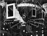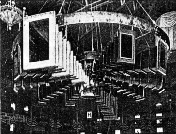 Ten loudspeakers called "projectors" hang from center of ceiling in Madison Square Garden, eight were 7 ft. long , the two white speakers were 10 ft. long, with 5 music-master horns suspended vertically below, photo from AT&T Archives |