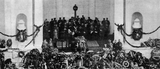 There seemed occasionally to be slight interference between the two kinds of sound - that which passed directly from their mouths to the ears of the audience and the very much louder tones which passed indirectly from their mouths to the audience by way of the amplifier on the platform in front of them. This occasional interference of sound waves made some of their words indistinct, but did not render them unintelligible. The sounds from Arlington, however, all came through the amplifier without disturbance from any second set of air waves.""The first words from Arlington Cemetery were those of a representative of the telephone who described the setting in Arlington Cemetery overlooking the Potomac with Washington in the distance and gave some of the details of the scene. The Audience broke into applause for the instrument after the first sentence had proved its astonishing reproducing qualities. Because of the solemnity of the subject, there was no further applause during the services until the close of the speech of the President, which was applauded nearly as heartily as if the Chief Magistrate had been there in person to hear it." (New York Times, 12 Nov. 1921, p. 7)