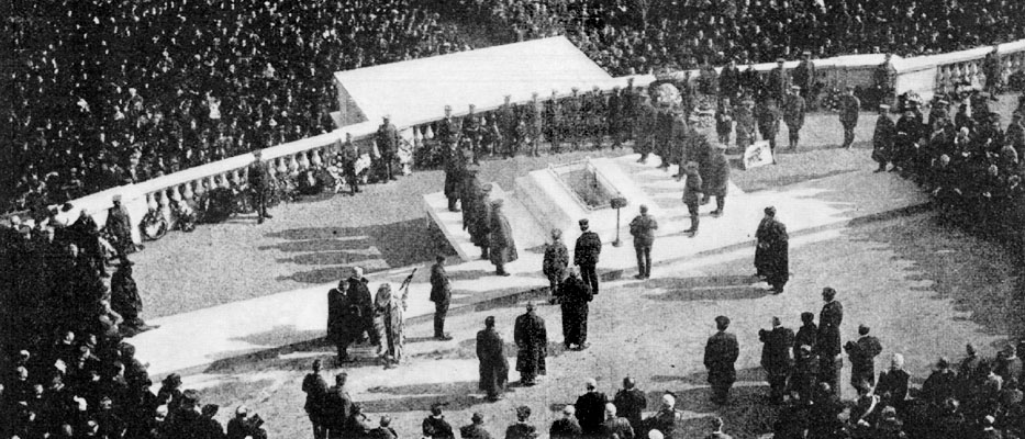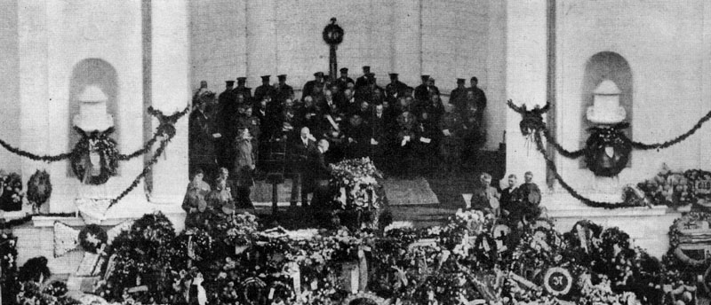 In Washington, 100,000 gathered at Arlington National Cemetery for the burial of the the Unknown Soldier. "Never before, perhaps, has there been such a gathering as assembled on the hills of the national cemetery overlooking Washington. While only a small portion who came to do honour to the Unknown could be accomodated within the enclosure where the leaders of this and other nations bowed before the bier of the unnamed hero, the vast multitude without, including ex-service men and many war mothers, followed the memorial ceremonies by means of the telephone amplifier, which impressively and with woderful distinctness reproduced the addresses. Not only the many thousands within the cemetery heard every detail of the exercises, but the nation's message of mourning was carried to distant cities."Upon every side of the immense amphitheatre the people massed. There they stood for many hours and followed the proceedings through the telephone amplifier which recorded the speeches and songs and prayers. While the scene within was impressive to the last detail because of its simplicity and the character of its actors, that without was equally so. When the President concluded his speech with the Lord's Prayer the crowds, head bared, repeated it. They sang 'Nearer My God to Thee' and the mighty voice was lifted to the far distant hills.