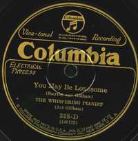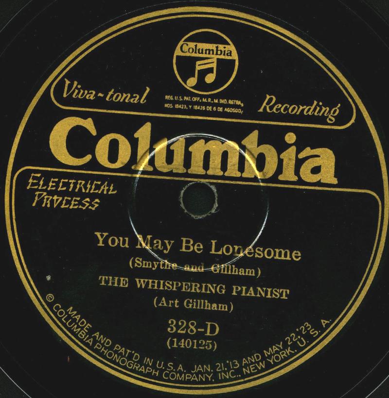 I had a friend who recorded for Columbia from 1924-1931. Art Gillham, "TheWhispering Pianist", is usually credited with making the first electricalrecording which was commercially released: February 25, 1925 master 140125,"You May Be Lonesome", Columbia 328-D. (High Fidelity Magazine, January,1977, p 95; also see Brian Rust, The Columbia Masters Discography1924-1934). Art was interviewed in 1961, a few weeks before his death onJune 6, 1961, and stated Columbia paid him a bonus of $1000.00 forexperimenting with the electrical recording process because of hisexperience in using microphones on radio broadcasts. He began appearing onradio in 1923 and was a performer of the November 4, 1924 election nightbroadcast from New York's WEAF which was carried on an 18 station "hookup".Also on that broadcast were Will Rogers, Wendell Hall, Carson Robison, TheShannon Four and the Joseph Knecht Orchestra. He appeared on approximately300 radio stations before network broadcasting. Label of the first Columbia electrical recording. |