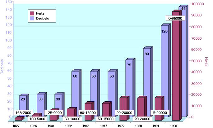 With multiple channels of sound reproduced on motion picture film for Disney's "Fantasia" and the Carnegie Hall concert of 1940, audiences were amazed at "the loudest sounds ever heard." The polyvinyl chloride plastic used to make the "vinyl" LP records in the high fidelity era after World War II did not require abrasive fillers and therefore produced less noise, resulting in a signal-to-noise ratio of 60 dB. (Figure 5) Sound quality improved in the 1960s with lightweight stylus tone-arms, Dolby noise reduction circuits, three-way speakers mounted in bass reflex enclosures. Despite these improvements, the bottleneck of analog sound reproduction remained the physical surface carrier. No groove could be cut small enough to reproduce a 20 mHz frequency tone, and no magnetic tape could rid itself of hiss.