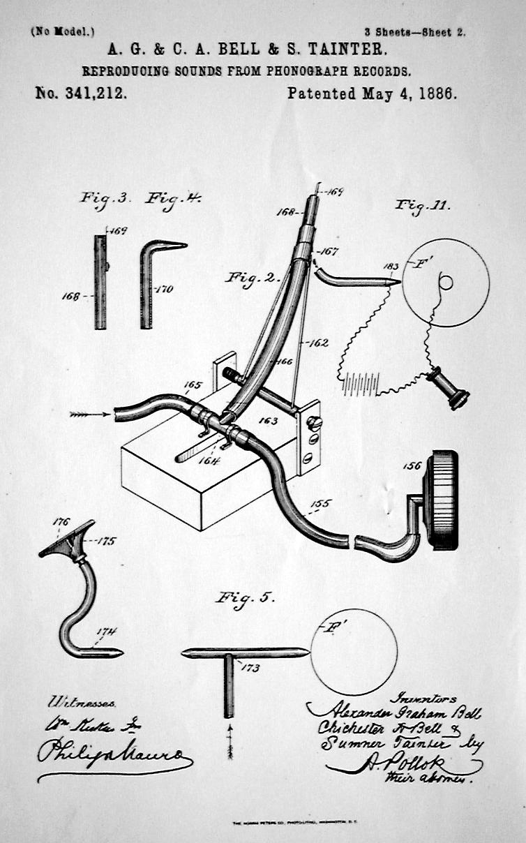 Tainter began making lateral-cut or zig-zag records July 9, 1881, but experiments were interrupted by an attempt to locate a bullet in President Garfield July 11-Aug 28. Work on the recording machine resumed in September. Fearing that Edison would learn of their work before patents were filed, Tainter and the Bells decided to prepare a sealed tin box to be placed in a vault in the Smithsonian Institution containing their work. "We did this," said Tainter, "so that if Edison's company should get hold of our invention, through any leakage of information, before our patent was complete, we would have dated proof of what we had worked out." [4] They also signed a formal agreement October 8, backdated to May 1, creating the Volta Laboratory Association to be the owner of their patents. The box began to be prepared in Sept. 1881 for deposit in the Smithsonian, but would not be sealed until Oct 20. It would contain the Edison phonograph with a cylinder coated with wax and recorded by indentation with the words of Prof. A. Melville Bell, father of A. G. Bell, who said "I am a Graphophone and my mother was a Phonograph." This was recorded at an exhibition of the apparatus Sept. 25 and sealed in the box with an air-jet tube for reproducing it, but not the other air-jet apparatus. Also included were signed testimonials from the Sept. 25 exhibition, copies of pages from Tainter's Home Notes. The word "graphophone" was a transposition of the word "phonograph" to convey the same meaning. Tainter said in his Home Notes that it was Alexander Graham Bell who originated the term "graphophone" sometime before March 28, 1881, when the Homes Notes began. The word was coined as a little joke according to Bell's relatives who listened to the recording when the box was opened in 1937. [5]