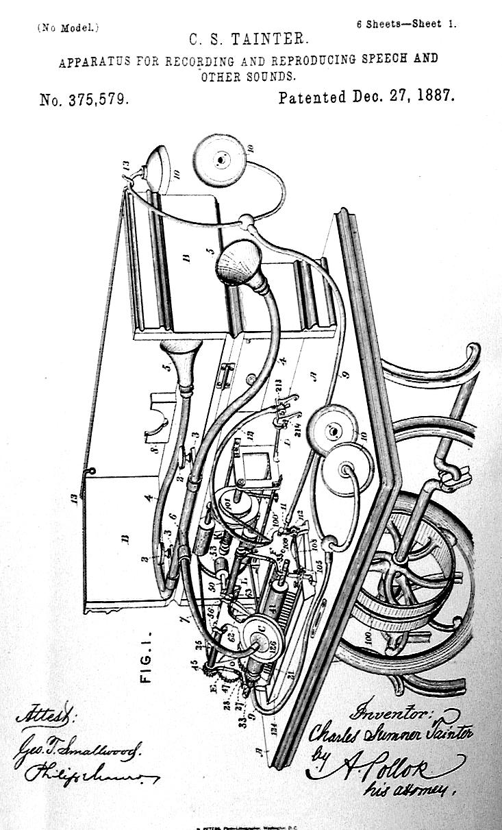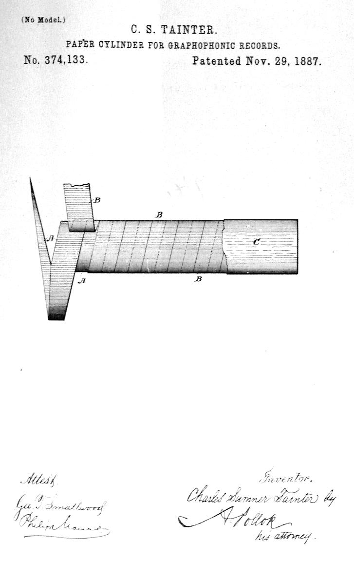 After 1900, the disc phonograph of Victor and Columbia would grow in popularity over the cylinder phonograph of Edison. Shellac would replace wax for mass duplication of records. Although the graphophone with its long 6-inch wax cylinder never succeeded in the market place, the influence of Charles Sumner Tainter was significant and long lasting. He had been the first to introduce the method of cutting a zig-zag spiral groove in the wax surface of a record to improve sound quality. The helically wound cardboard tube would become a widely used packaging product. His work at the Volta Laboratory with selenium and the photophone were the first successful attempts at wireless communication using light waves. His Graphophone Company would lay the foundation for the later success of the Columbia Phonograph Co. and the Dictaphone Co. His more than 40 patents, including 25 in the field of sound recording, made him one of the most productive experimental scientists in that Heroic Age of Invention that produced Bell and Edison and Berliner at the end of the century.- Unless otherwise noted, the information on Charles Tainter is from his unpublished manuscript "The Talking Machine and Some Little Known Facts in Connection with its Early Development," Tainter Papers, Smithsonian National Museum of American History, Washington D. C.