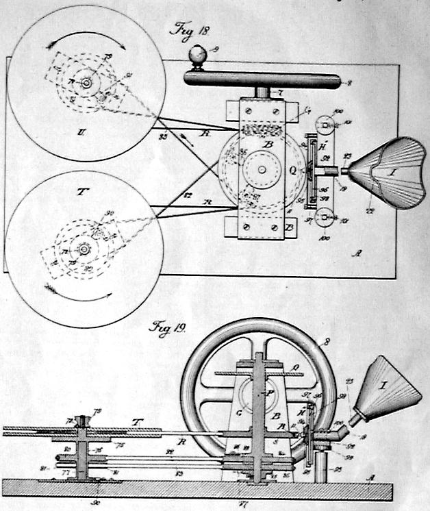 "In the early spring of 1885, I designed and made a model of the form of talking machine shown in Figs. 18-19-20 of patent 341,214, which forms the records on long narrow strips; in this case, strips of paper coated with the wax mixture we were using at that time." This was described in the patent lines 66 on p. 5 to line 24 on page 6. From this machine, Tainter learned the need to reduce the size of the record groove. "This was a very important discovery, and I followed it up immediately, by constructing a machine of the cylindrical form." Tainter's drawings of his first cylinder machine were given to a mechanic and it was built by May 14, 1885. This was a machine similar to patent 341,288 with a paper cylinder 9-inches long and 2 inches diameter coated with a wax mixture 1/4-inch thick. The cylinder played for 10 minutes and the spacing between grooves was 1/250 inch (i.e., 120 grooves per inch "pitch").