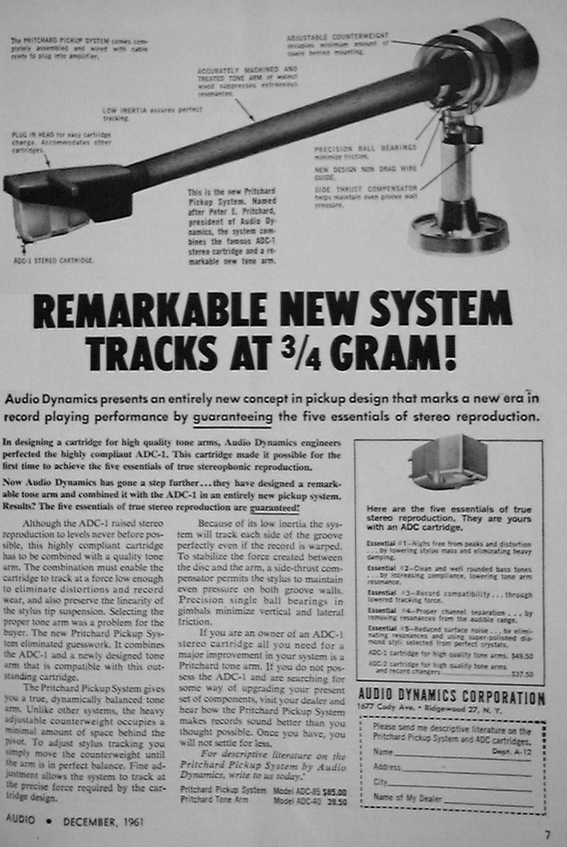 Cartridge & Tonearmand ADC-1 pickup cartridge ad from Audio 1961/12 | Turntablead from Audio 1958/07 | Amplifierad from Audio 1959/11 | Speakersad from Audio 1960/12 |