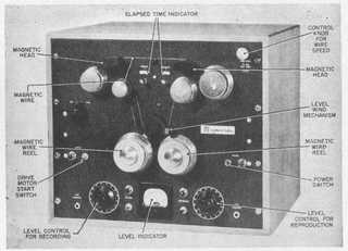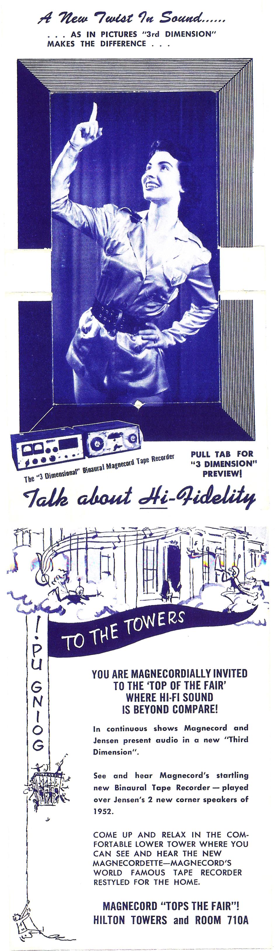 | Hanna, Phil. "U. S. Youth Still Shows Courage and Ingenuity." Chicago Daily News, July 29, 1946, p. 22. "Those who think this generation of American youth has lost some of the traditional courage and ingenuity of the nation's builders ought to acquaint themselves with the five young 'partners' in Magnecord, Inc., 304 W. 63rd st. Here one sees two former combat correspondents in the Pacific and three electronic technicians teamed up. They've started manufacturing special purpose high fidelity wire recording machines for radio station recording, motion picture producing and other scientific work. Among other products is an anti-wire tapping device. After a message is put on a wire recorder, the device 'scrambles' the message as it is being transmitted. That makes it unintelligible. At the receiving end the device 'unscrambles' the message, and the recording 'plays' the message properly. Magnecord, Inc., is operating under a license from the Armour Research Foundation along with 30 other licensees. But the other licenses are devoting themselves to mass-produced wire recorders for home and office use, while these boys are looking toward demands from the technical and professional field. Their rcorder is designed for special, high-grade work, such as recording unusual sound phenomena in research laboratories. R. J. Tinkham, president, is an Armour Research man and a graduate of the University of Illinois. He is an acoustical engineer, did research work on wire recorders and other special devices for the Bureau of Ordnance, U.S.N., during the war. John S. Boyer, chief engineer, another Armour man, did research on underwater sound devices at the New London (Conn.) laboratory of Columbia University. He also did research work on radar at the radiation laboratory of Massachusetts Institute of Technology. Frederick A. Baxter, secretary, and C. G. Barker, sales manager, were war combat correspondents in the Pacific for three years; made the first combat wire recording at Mount Tapotachu on Saipan; made the first recordings for Army air shows. Their recordings were sent to the United States for use by radio stations and to Honolulu for conversion into wax records which were distributed over the United States. Barker worked at Armour Research Foundation prior to forming Magnecord. R. L. Landon, another Armour man, fifth member of the 'Five Horsemen,' is production manager. He worked on atomic bomb research at the University of Chicago and had war plant production experience. . . ." Hanna, Phil. "Recorders Pay Off For 5 Young Men." Chicago Daily News, Nov. 30, 1949, p. 42. "Back in July, 1946, I wrote about five young fellows who worked for the Research division of Illinois Institute of Technology. They set up shop at W. 63d st., to make a special purpose high-fidelity wire recorder. Their youthful enthusiasm for going into business on their own was notable. I had an idea they would succeed. So the other day I checked up to see what they had done in three and a half years on their own. Like so many new firms, they altered their product in May, 1948. They are selling a tape recorder to broadcasting stations and other professional users. They tell me all national radio networks use their machines; that of a total of 3,000 professional users, they have 2,300 machines in use. They say they are doing special work for such firms as the Bell Telephone Laboratories. The little firm, known as Magnecord Inc., has outgrown the 63d st. location with 2,000 square feet. It is now housed at 225 W. Ohio st. with 9,000 square feet. They have 90 employees compared with 12 at their former location, are doing $90,000 a month in sales. R. J. Tinkham, 38, is president. Their success is helped along by a vigorous sales policy. C. G. Barker, 28, sales manager, says that no matter how good your product, it has to be sold by intensive solicitation. He doesn't believe in the 'better mousetrap' theory. He set up 11 regional factory representatives and 106 distributors, and says business is especially good in the Southeast - that Georgia is booming. J. S. Boyer, 34, is chief engineer. He has four other young engineers constantly working to better the product. R. L. Landon, 32, is production manager, which rounds out about the most closely knit top organization I have recently seen. F. A. Baxter, the fifth of the original group, left the organization. 'Don't think we didn't have our troubles,' says Tinkham - 'we know what a 70-hour week is. But Chicago firms helped, the bank helped - and now we can see daylight.' A net worth of $121,000 seems to confirm." Canby, Edward Tatnall. "The New Recordings." Saturday Review, August 13, 1949. "...work with the newer, second-round crop of home tape machines is undeniably easy and increasingly foolproof. The first machines, like most new gadgets, were over-elaborate and bug-ridden. Things went wrong. The pioneer Soundmirror was a typical first-off product, with its three separate motors, baffling handfuls of interlock switches, automatic starts and stops that went haywire (for me anyway). Its successor is far more tractable, and recording procedure is currently being even more streamlined in dozens of sharply competing new models. The average home machine runs at seven and one-half inches per second, half the professional tape speed, in either single-track or double-track form, giving home-type sound quality generally a bit better than equivalent disc phonographs, tonal range from 5000 or so (too low) up to 8000, somewhat less than 'high fidelity.' Single-track machines run a half hour per 1200 ft. roll, double-track models two half hours, the tape running through twice. The 'Twin-Trax,' [made by Amplifier Corporation of America] with automatic reverse, gives an unbroken hour per roll. Double-track is economical but note that it cannot be cut and spliced as can single-track tape - a major disadvantage in some cases. For those who must have real hi-fi, the ne plus ultra is the Magnecord. This