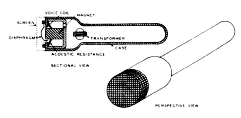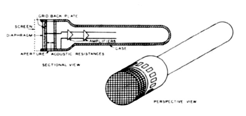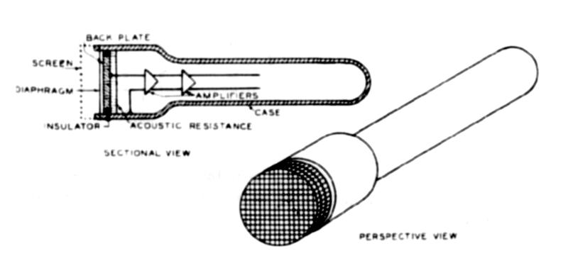 The electret electrostatic microphone ca. 1970 has a permanently-charged plastic film diaphragm plated on one side. The addition of a field effect transistor allows high impedance input and a uniform frequency response of 30-15,000 Hz.