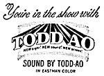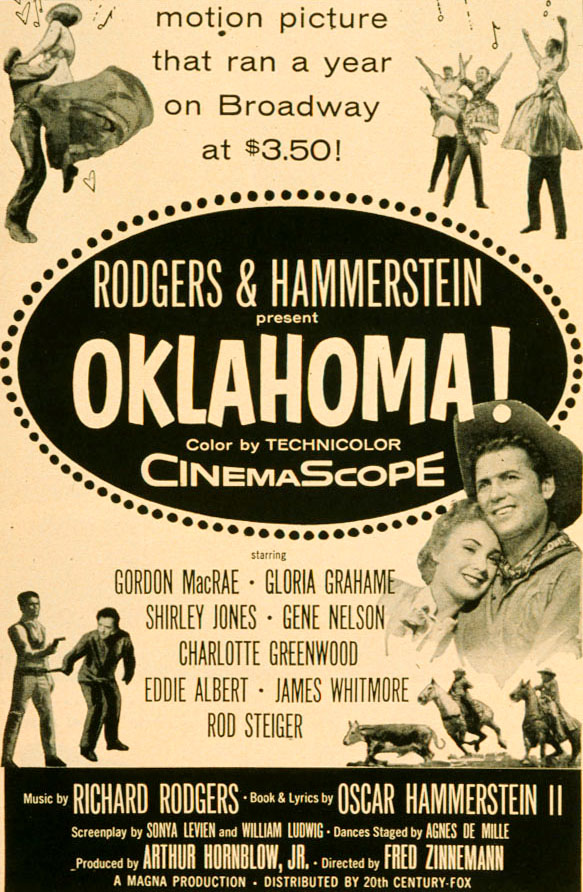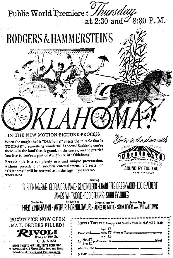 Image at left from 1955 newspaper ad for the Cinemascope version of Oklahoma! that was filmed at the same time as the experimental Todd-AO version and was exhibited in theaters not equipped with Todd-AO equipment. The 1994 laserdisc restoration of Oklahoma! used the Todd-AO version with some scenes filmed differently than the Cinemascope version. From 1950s to 1970s, expensive 70mm films used 6-track magnetic soundtrack 5mm wide placed on the filmstrip between the image and the sprocketholes.