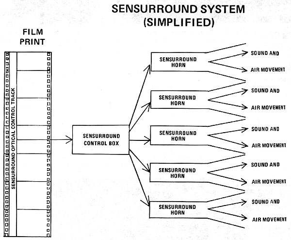 1974 - Earthquake premiered Nov. 15 in the Chinese Theater in Hollywood with Universal Picture's Sensurround process developed by W. O. Watson and Richard Stumpf at Universal. Four large low-frequency horns were located behind the screen, two in each corner. The Model W horn in each corner was 8 ft. long, 4 ft. wide, 4 ft. high. The Model C horn in each corner was a modular unit 1 ft. wide and 5 ft. high. Two additional horns were located on a platform in the rear of the theater. Each horn was driven by a 1000-watt amplifier controlled by inaudible tones on a special optical control track along with the normal 4-track magnetic soundtrack of the 35mm Panavision filmstrip. These films could only be played with Sensurrond-equipped projectors. Normal 4-track magnetic projectors could play the soundtrack but not the Sensurround effects. A 35mm optical print was released with monophonic sound and included the control signals to activate the special speakers if they were installed in the theater. Some prints released in Europe and Japan were 70mm with 6-track magnetic soundtracks using tracks 2 and 4 for the control signals. The tones turned the horns on and off at preset volumes, creating low-frequency vibrations 5-40 cycles at sound pressures of 110-120 db, causing the audience, chairs, floor to "feel" the vibrations of the earthquke and dam destruction scenes. Image at left from the Nov. 1974 American Cinematographer diagram for Sensurround