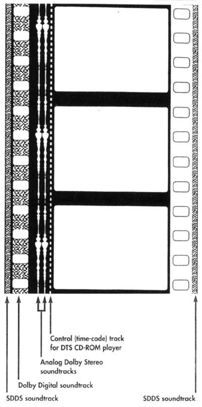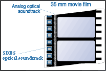 1993 - Last Action Hero released July 18 using the Sony Dynamic Digital Sound (SDDS) digital sound film format that put 6 or 8 tracks of digital sound on 2 optical stripes on each edge of the film strip, recorded on the cyan layer beneath the other emulsion layers, using the lossy ATRAC algorithm of the Sony Minidisc technology with a compression ratio of 5:1, dynamic range of 105db and a frequency response from 5-20,000Hz. It is compatible with a backup standard optical soundtrack such as Dolby SR.
