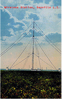 "Beginning in 1911 the Telefunken Company of Germany built a wireless station in West Sayville just north of the railroad tracks. A 500 foot tower that could be raised and lowered rose from a ball and socket joint atop a concrete foundation. It was completed in 1912 and wireless messages could then be transmitted to a similar tower in Nanen, Germany, 3,500 miles away. From August 1, 1914, until April 6, 1917, the United States monitored messages sent over the Telefunken wireless and U.S. Marines guarded the station. After the U.S. declared war the station was sealed off, the wire fence surrounding it was charged with electricity, and floodlights were placed throughout. After World War I it was taken over by the MacKay Radio and Telegraph Company and later the FAA. Presently it is not in use by anyone. The huge mast was demolished in 1938." (Suffolk County News on December 20th 1918, from Sayville Library