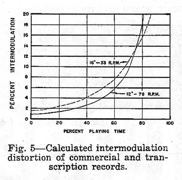 It will be noted that in both cases the intermodulation distortion exceeds 10 per cent part way through the record and confirms the listening tests. The cumulative evidence of these tests resulted in the decision to select design parameters for the new record such that the intermodulation distortion at the innermost groove would not exceed 10 per cent.