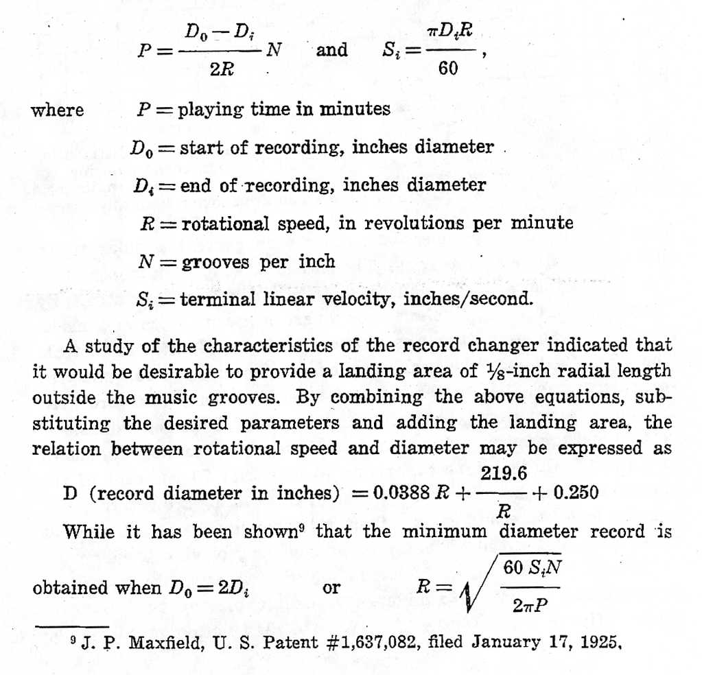 A study of the characteristics of the record changer indicated that it would be desirable to provide a landing area of 1/8-inch radial length outside the music grooves. By combining the above equations, substituting the desired parameters and adding the landing area, the relation between rotational speed and diameter may be expressed as