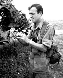 Peter Arnett with burned-out airplane near Bien Hoa in 1965 (AP) |