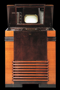 1939 - Jan. 1 Zworykin and NBC finally were granted a patent for the image orthicon tube after 15 years of litigation with Frarnsworth who still controlled the basic electronic television tube patent. On April 30 FDR opened the New York World's Fair on W2XBS, and RCA introduced its first commercial TV set, the mirror-in-the-lid TRK-12 for $600.