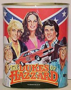 The Dukes of Hazzard first appeared on CBS Jan. 26, 1979, and continued for six seasons, until Aug. 16, 1985. It revived the rural comedy genre pioneered by the Beverly Hillbillies in 1962. In this comedy series that ranked #9 in 1979 and #2 in 1980 and #6 in 1981, "Hazzard County" was located "east of the Mississippi and south of the Ohio" where Luke and Bo hot-rodded their Dodge Charger, named the "General Lee" (300 versions of this car were crashed during the six seasons) and fought against the corrupt Boss Hogg, in his white flannel suit. The success of the series generated similar shows: Lobo, Harper Valley PTA, and an animated Dukes for Saturday morning, and a wealth of merchandise such as the trash can above, sold by the producer, Warner Bros.Cast:
