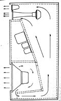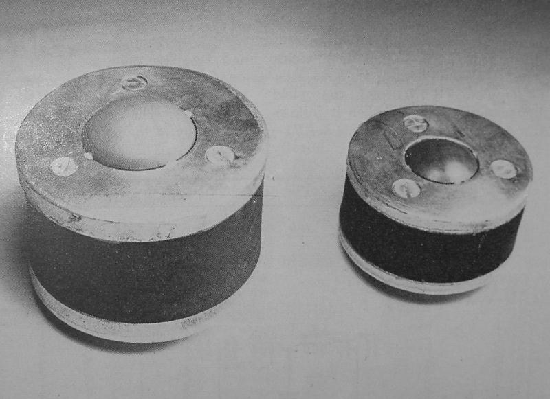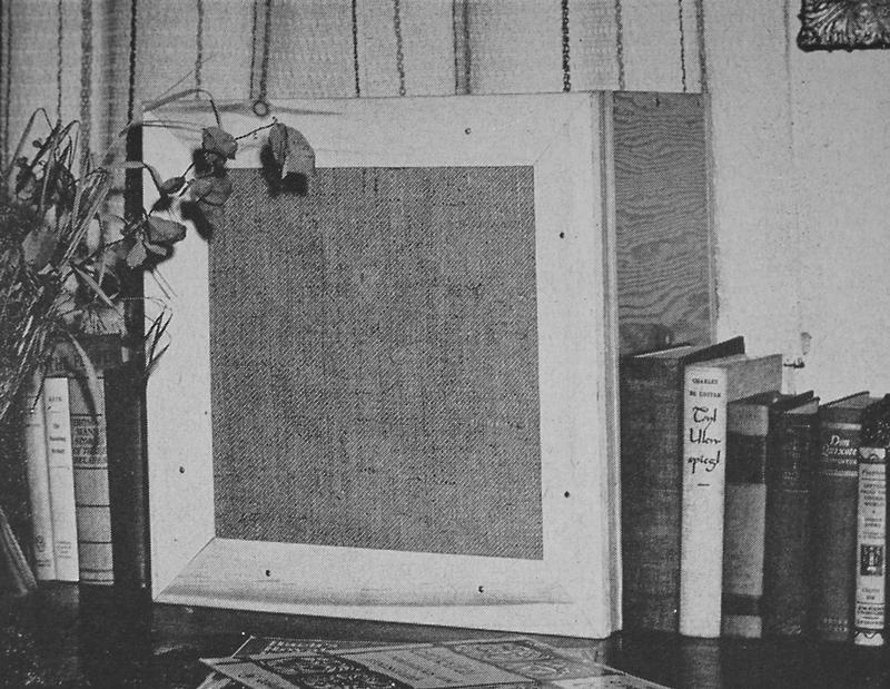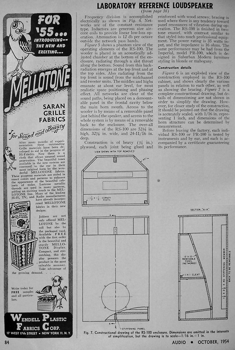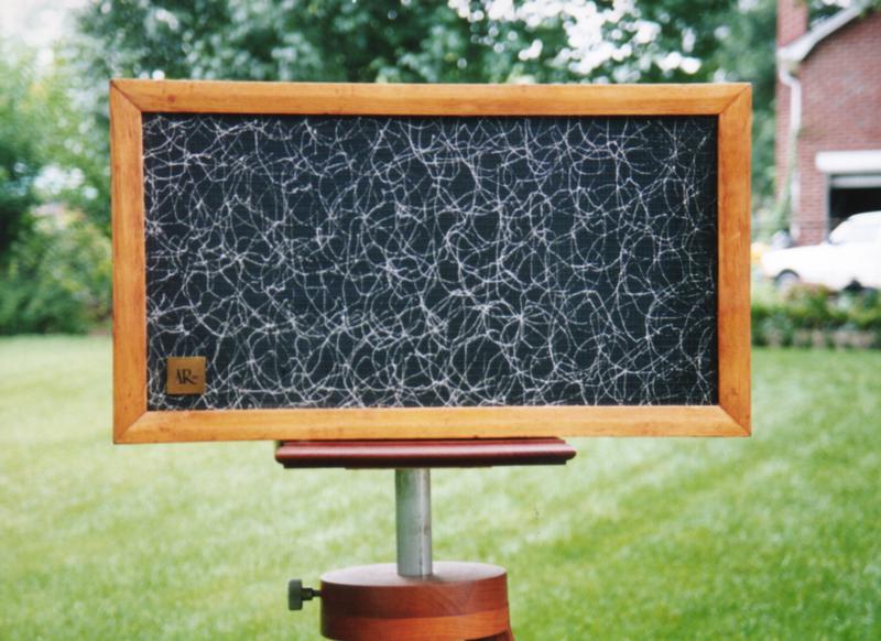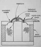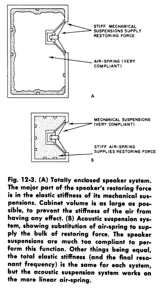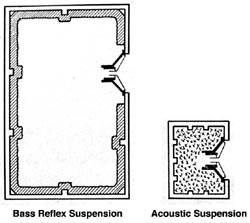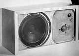 Villchur used two standard 12-inch Western Electric loudspeakers in designing his new enclosure. "I cut away part of the spider of one of them, making it more compliant. I also cut away the entire rim suspension and replaced it with a suspension made of mattress cover material (bacause it is very compliant, and adequately impervious to air). My wife, Rosemary, had worked as a draftsperson during WWII. With those skills, she was able to project my sketch of the three dimensional suspension to the correct pattern on the mattress material so that I could cut it out and form it to the shape I needed. I mounted the second Western Electric speaker on a baffle at the head of an enclosed stairway, so I could compare the performance of my acoustic suspension system with an enclosure volume of two cubic feet against and infinite baffle system with well over 100 cubic feet. The acoustic suspension system was substantially superior in fulness of bass, and especially in lack of distortion." (Birchall 1993)