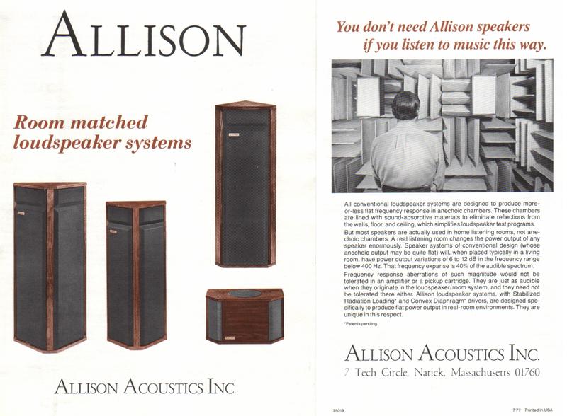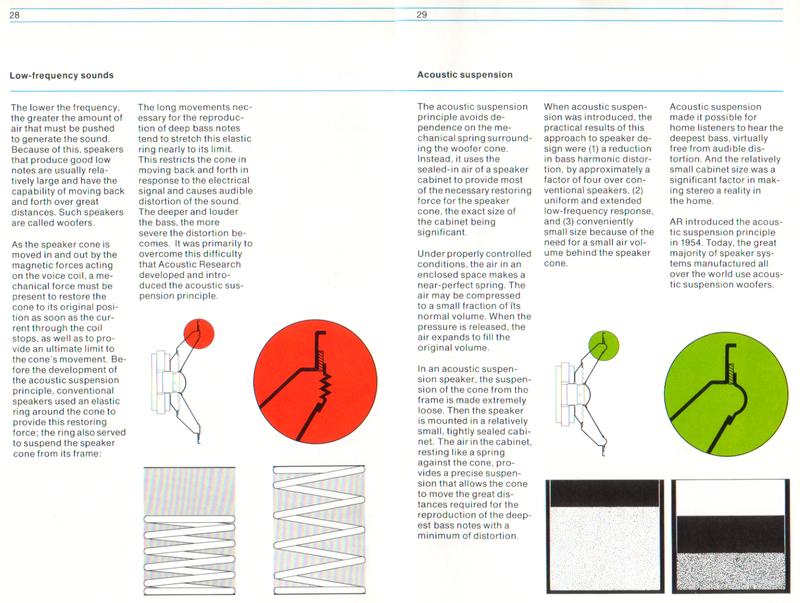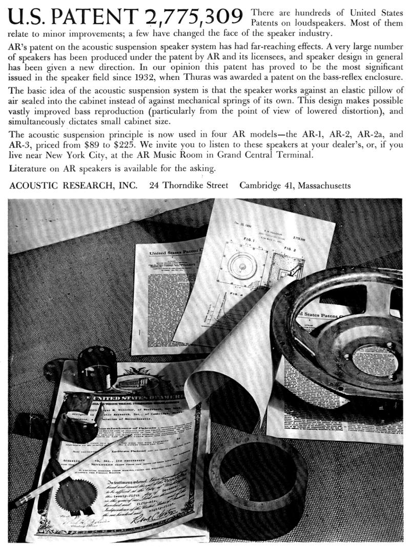 The acoustic suspension speaker of Edgar Villchur has been considered one of the five most important speaker designs since the Rice-Kellog dynamic speaker of 1925. "What really caught the public fancy, however, was the fact that the original Acoustic Research AR-1 was a small loudspeaker system having essentially flat low-frequency response to below the 40-Hz region. Other manufacturers were quick to point out that the AR-1 gobbled up about 10 times the electrical power needed by larger, more efficient systems. With 50- and 60-watt amplifiers becoming available, this turned out not to be a major drawback, and the trend toward smaller, less-efficient home loudspeaker systems was firmly established." (Augspurger 1987)