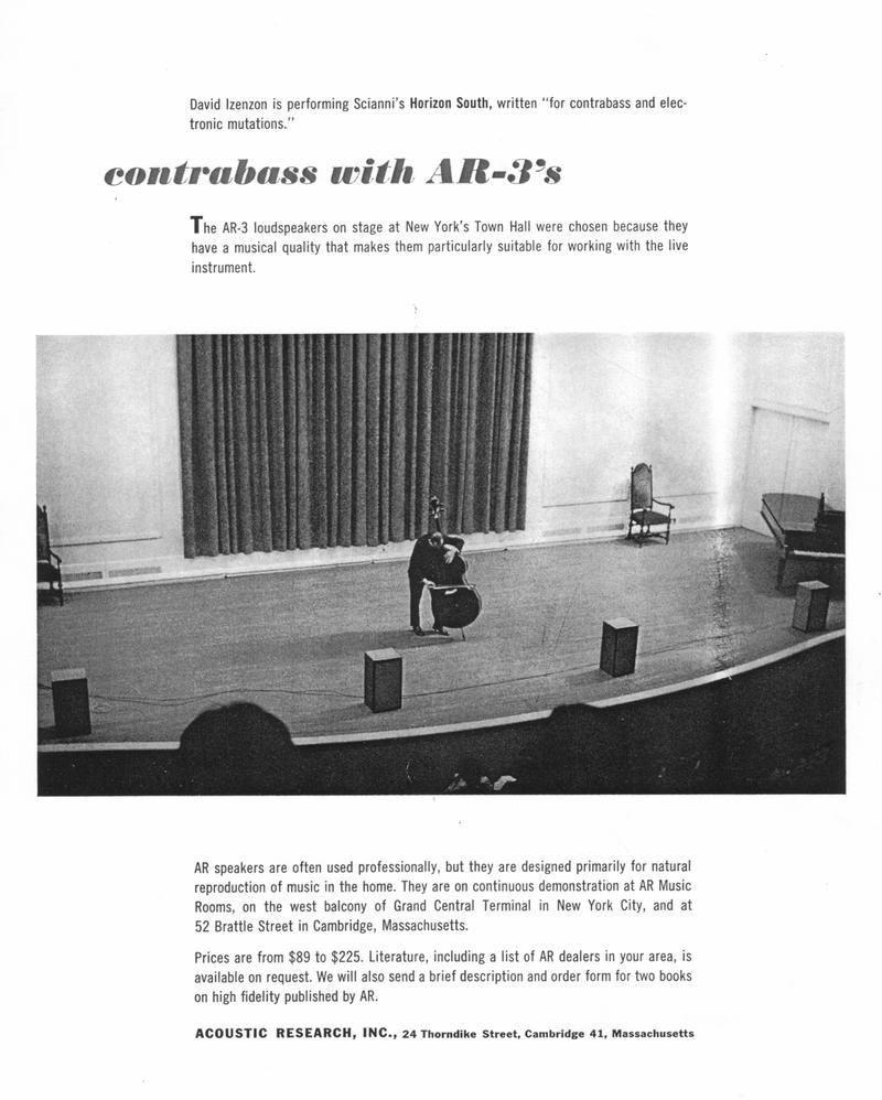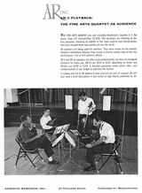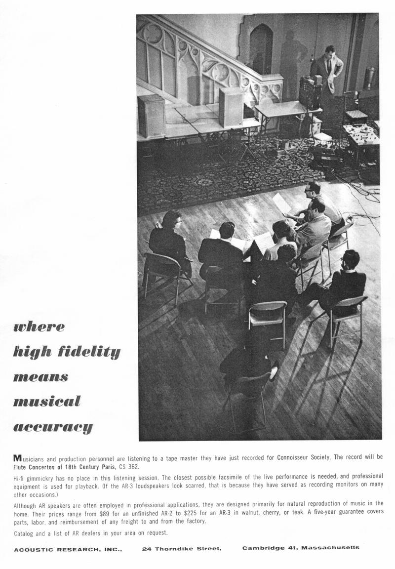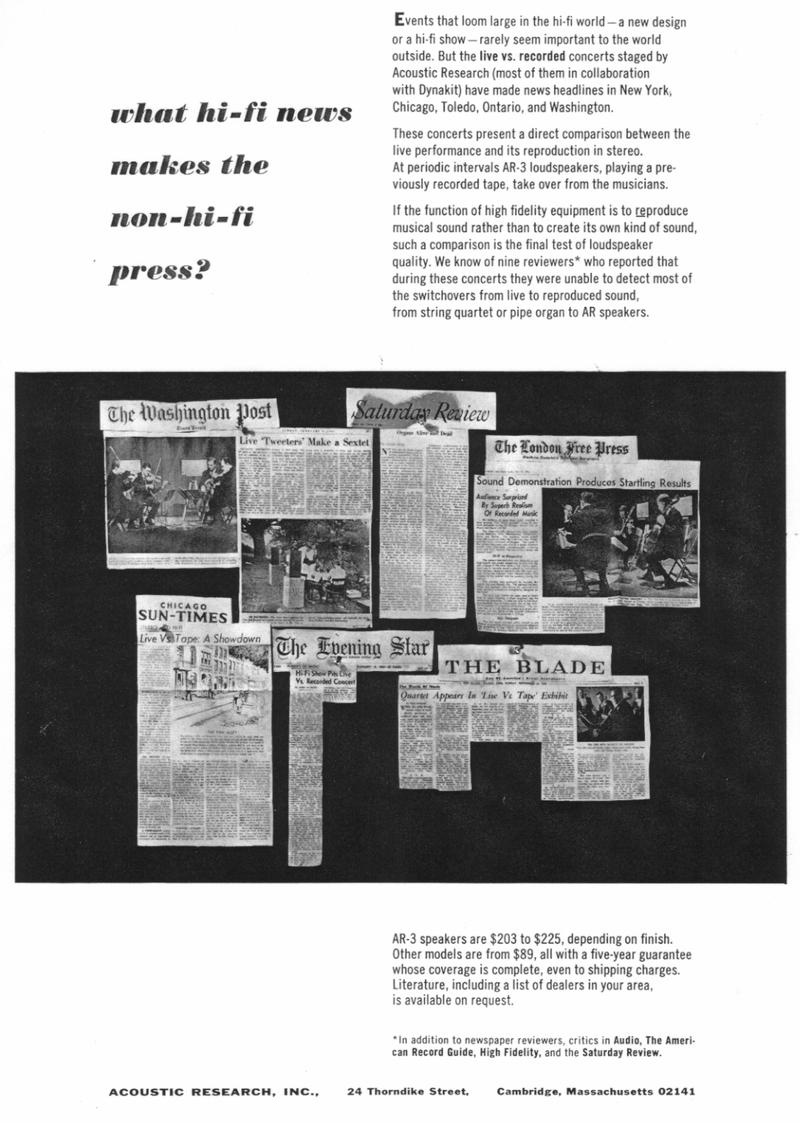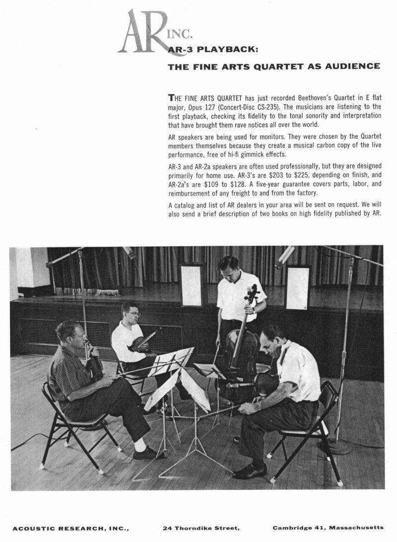 Villchur himself wrote most of the advertising copy and brochures for the company in the 1950s and 1960s, emphasizing facts and performance. This style of the 1960s ads continued in the 1970s ads. Villchur sponsored "live vs. recorded" concerts to demonstrate the accuracy and low distortion of his speakers. "He placed the musicians (the Fine Arts String Quartet, among others) on the stage, with a pair of AR-3 loudspeakers behind them. At various points, they would stop playing and the taped performance would take over. Most reviewers of the day could not tell the difference between the live and recorded sound. 'I thought these concerts defined what we meant by high fidelity,' commented Villchur. He took care to use the best equipment possible at the time, including an Ampex tape deck, two 60-watt Dynakit amplifiers, and number 18 zip cord." (Birchall 1993)