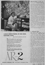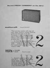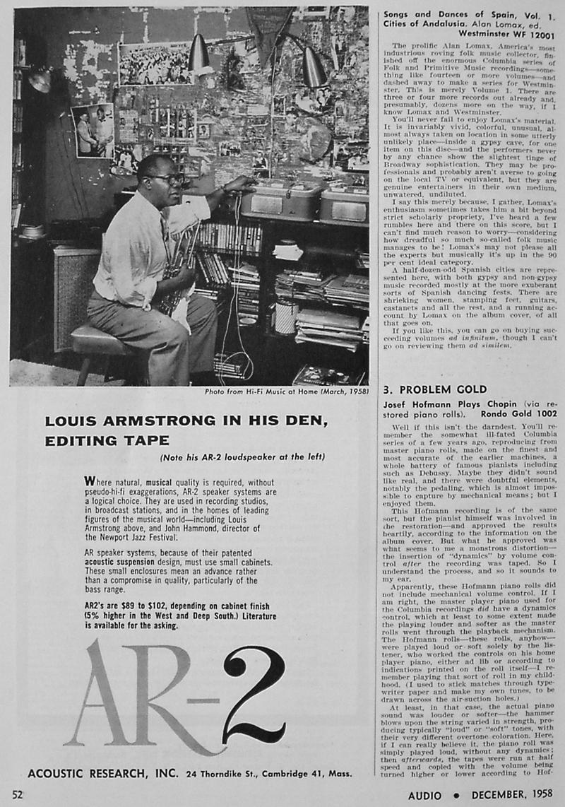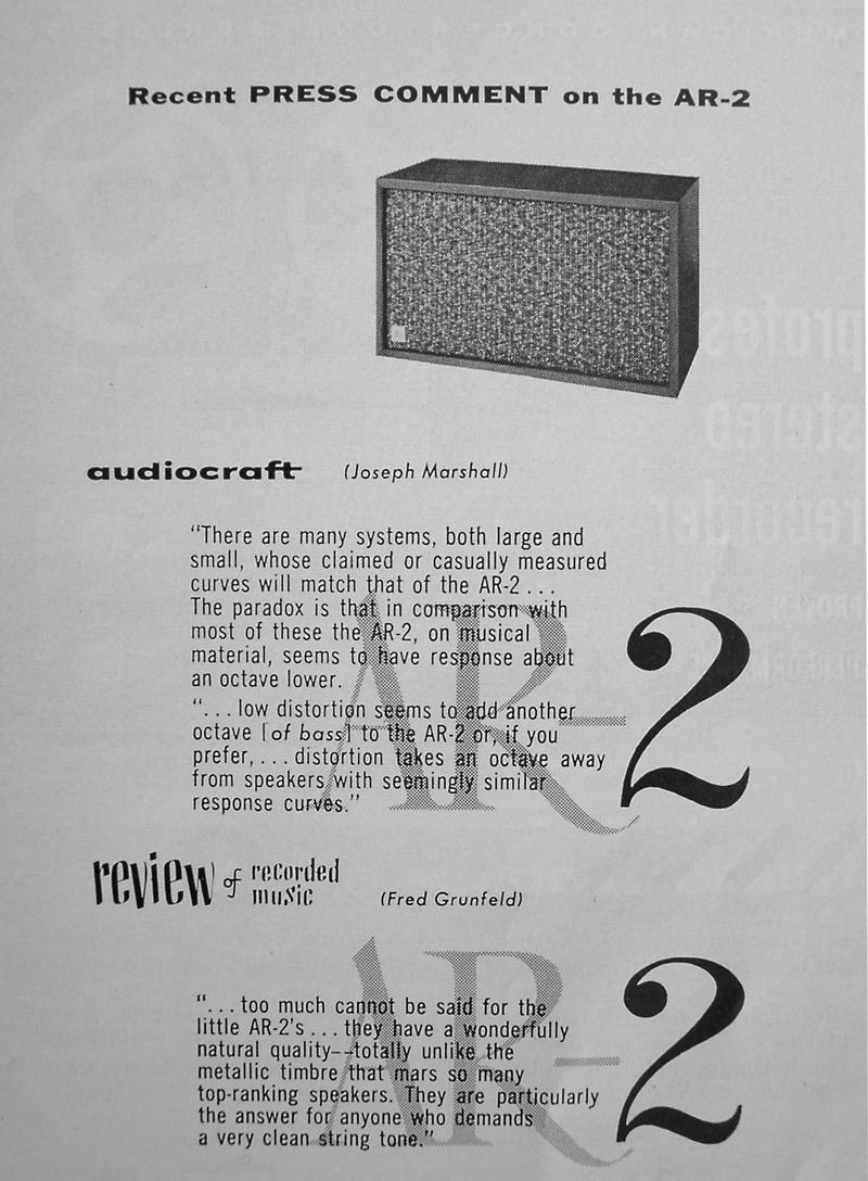 Villchur lowered the cost of his speaker with the $89 AR-2 model introduced in 1956. The use of this small inexpensive speaker by such notables as Louis Armstrong was featured in AR's advertising. By 1958, Villchur added a new tweeter to the AR-3. "The dome tweeter was Villchur's answer to the problems of high frequency dispersion. 'When you are listening to a loudspeaker in a normally reverberant room, and that loudspeaker has excellent on-axis high-frequency response but depressed off-axis response, the loudspeaker will sound dull in any listening position in the room, including one directly on-axis, because the major part of the sound you hear is that reflected from the walls, floor and ceiling. Putting a dispersing lens in front of the driver doesn't help much because there isn't enough high-frequency energy to disperse. The secret of high-frequency dispersion can be stated in two words: small size. Shrinking a cone tweeter to a small size doesn't help because the voice coil becomes too small to handle any appreciable amount of power. I placed my voice coil at the large diameter of the diaphragm. When you do that, the shape of the diaphragm emerges almost naturally as a dome. That has the further advantage of making unnecessary a second suspension, and it also greatly facilitates solution of the other problems (irregular frequency response and response at the extreme high frequencies). Some years later, Roy Allison improved the dome tweeter by making one with a pulsating motion.'" (Birchall 1993)