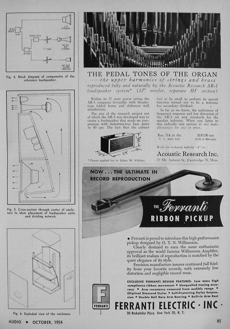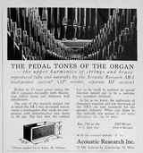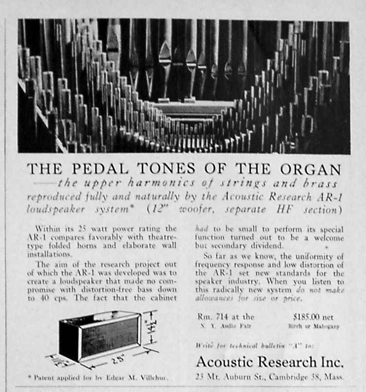 Acoustic Research in Cambridge started with $4000 that Kloss raised from his friends, plus $2000 from Villchur. Since they didn't have the capitalization to hire a production engineer to convert the prototype into a production model, Kloss worked out the details. "Henry was responsible for at least 75 percent of the production design of the AR-1. The rest was done by me and by Tony Hoffman, a physicist friend of Henry." They assembled several AR-1 loudspeakers in time for the New York Audio Show in September 1954. Although the critics were impressed with the clean 32-Hz organ pedal tones that the AR-1 could reproduce, they did not quite get the point. "One critic commented,' If your space is limited and you're looking for a small speaker, you should consider the AR-1 very seriously. It's a fine speaker - for its size.' Julian Hirsch, who at the time published the Audio League Report, wrote that 'the AR-1 had the lowest electroacoustic efficiency of any loudspeaker on the market - but at 25 Hz and below, it was more efficient that the Klipschorn, which had the highest efficiency of any speaker on the market.' Hirsch also said that the AR-1 'established a new industry standard for low distortion bass.' Eventually, the industry began to realize that the smaller size of the cabinet was only a secondary advantage of the extended bass response." (Birchall 1993)