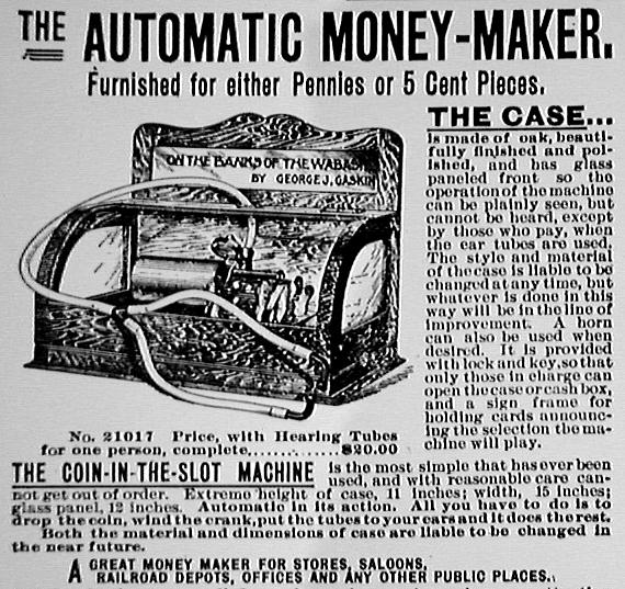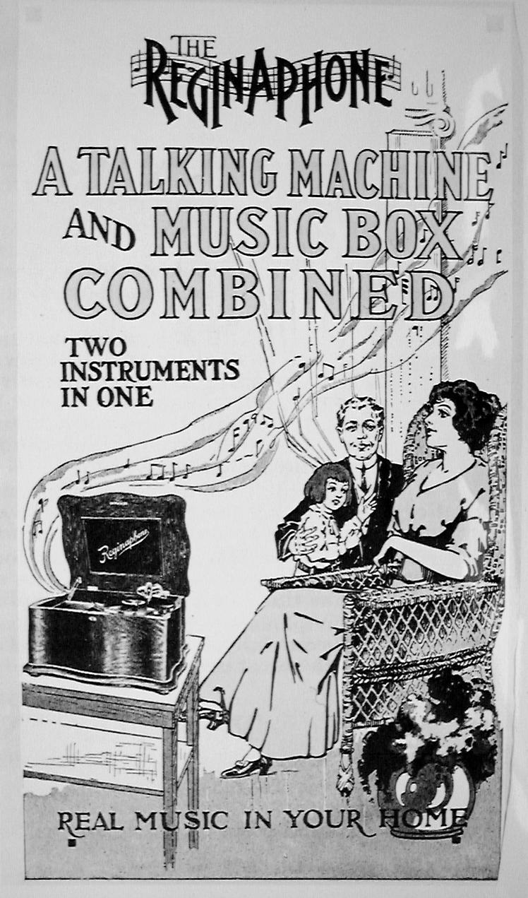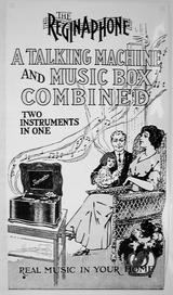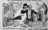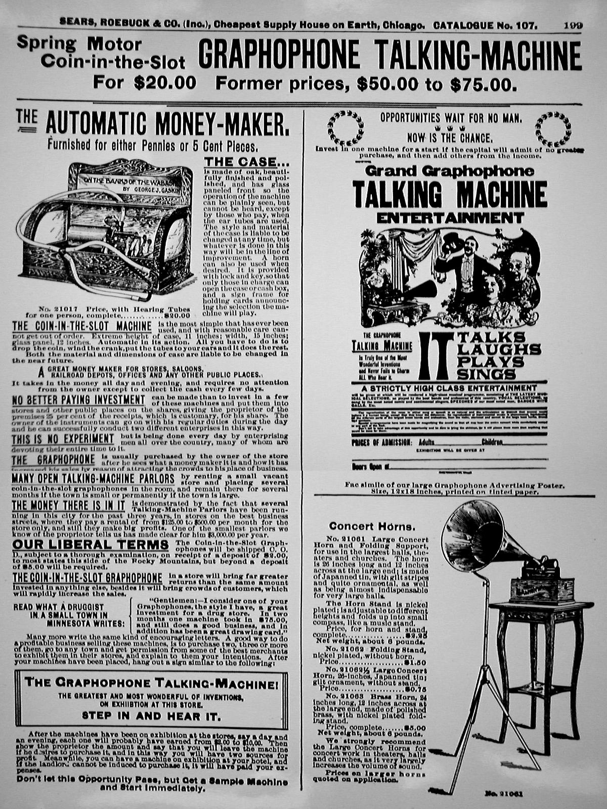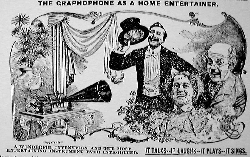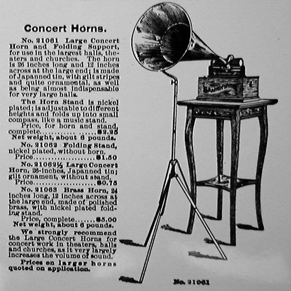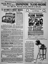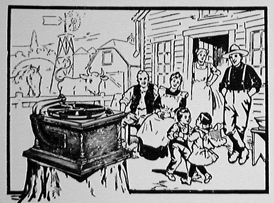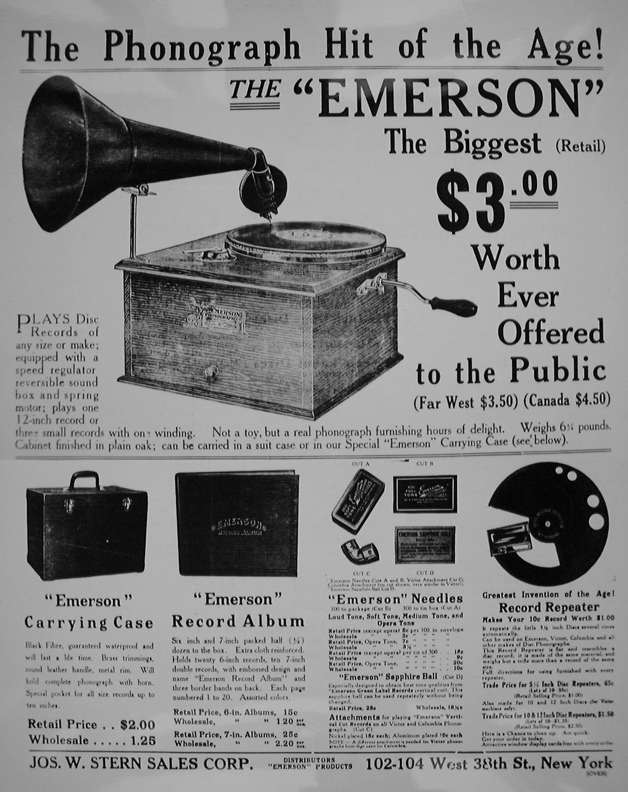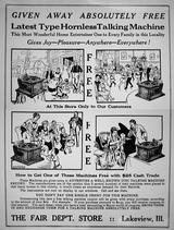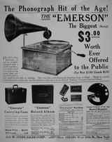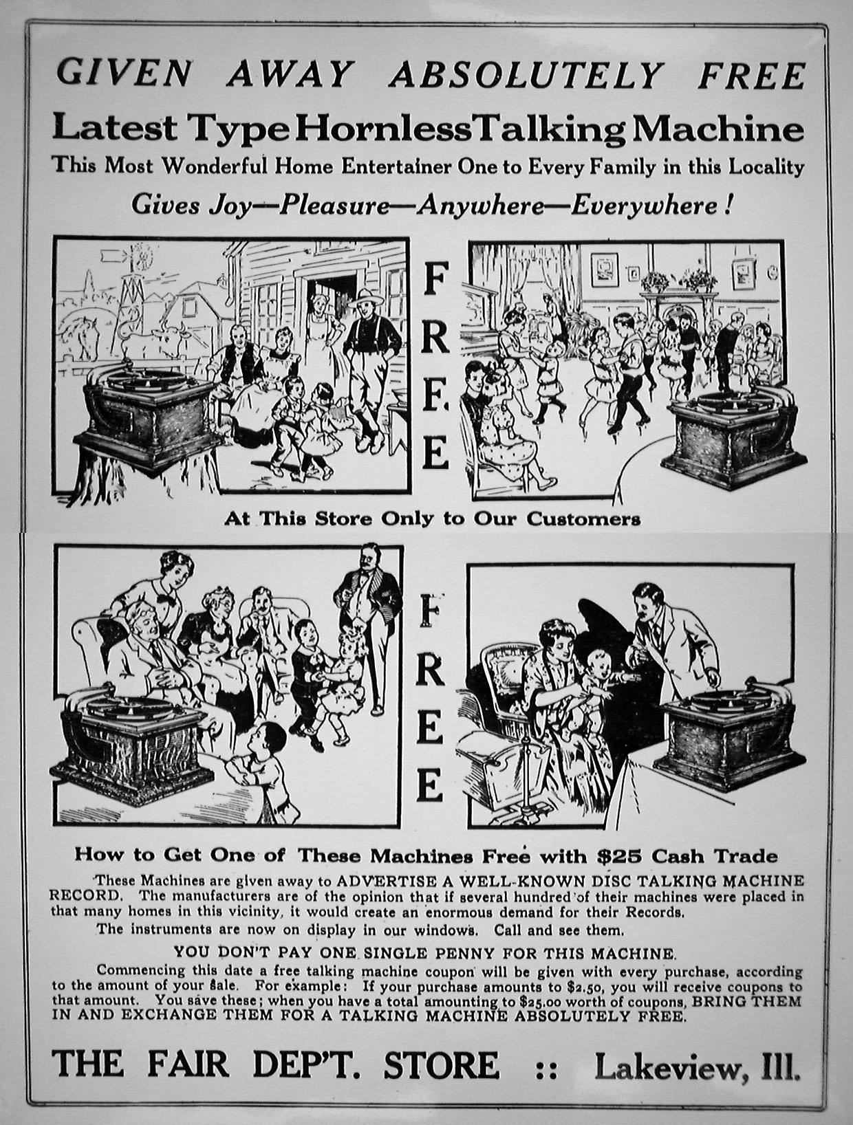 Emerson portable phonograph plays flat discs, with horn, optional carrying case, album, needles, record repeater - "The Phonograph Hit of the Age!" - selling for $3.00 - "Not a toy, but a real phonograph furnishing hours of delight" - ad ca. 1910 by Stern Sales Co. of New York from Warshaw Collection, NMAH | optional phonograph album for the Emerson portable phonograph - ad ca. 1910 by Stern Sales Co. of New York from Warshaw Collection, NMAH | Fair Dept. Store in Lakeview, Ill., ad ca. 1910 for the "Latest Type Hornless Talking Machine. This Most Wonderful Home Entertainer One to Every Family in this Locality Gives Joy - Pleasure - Anywhere - Everywhere" - Fair Store is giving away free phonographs to advertise "a well-known disc talking machine record." from Warshaw Collection, NMAH | cu of illustration from ad showing rural farm family listening to phono on tree stump - Fair Dept. Store in Lakeview, Ill., ad ca. 1910 for the "Latest Type Hornless Talking Machine. This Most Wonderful Home Entertainer One to Every Family in this Locality Gives Joy - Pleasure - Anywhere - Everywhere" - Fair Store is giving away free phonographs to advertise "a well-known disc talking machine record." from Warshaw Collection, NMAH |