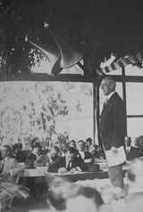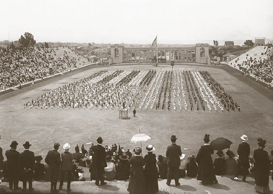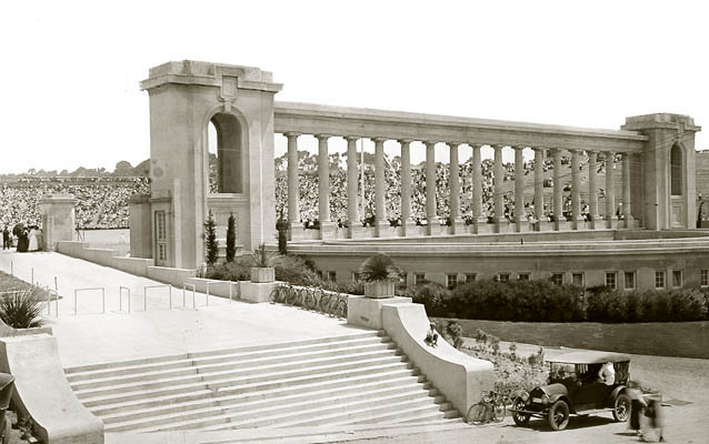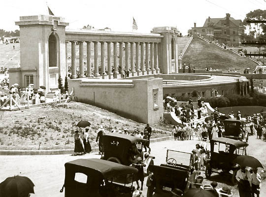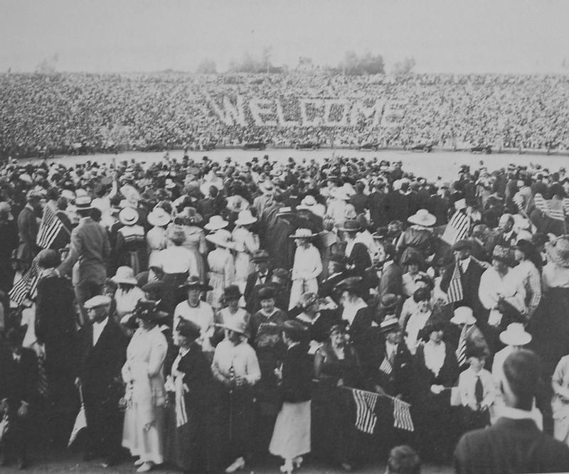 President Woodrow Wilson came to San Diego September 9, 1919, to plead for his League of Nations, arriving at the Santa Fe depot on a special train with a squadron of seaplanes flying overhead. He began speech at 5 pm in City Stadium (later renamed Balboa Stadium) in Balboa Park. The stadium had been built for the 1915 Panama-Pacific Exposition and with a seating capacity of 23,500, the largest of its kind on the West Coast. Wilson was in ill health and spoke from a glass-enclosed platform at the south end of the stadium. 50,000 crowded into the stadium and the temporary bleachers on the field. Wilson voice was amplified by a public address system recently developed by Magnavox, based on the invention of a loudspeaker in 1911 by Peter Jensen and Edwin Pridham. Pridham had come to San Diego to supervise the installation and Jansen was in the glass platform with Wilson. Rather than use a microphone, Wilson stood on a circle drawn near the front of the stage and spoke into two large horns suspended over his head that directed his voice to the microphone. The loudspeakers were hidden behind flags and bunting around the platform. Although a tube in the amplifier shorted and had to be replaced just before the speech, the system worked well during the hour-long speech. The audience could clearly hear Wilson's words, applauded and shouted their approval. Wilson's voice could be heard one mile from the stadium. The sound did not project clearly to the far north end and people moved to the field to get closer to the glass platform. Pridham later concluded that the large size of the glass-enclosed platform created an echo effect that made Wilson's voice sound hollow in some directions. Wilson later collapsed in Pueblo Colorado and returned to Washington DC where he suffered another stroke and remained incapacitated for 6 months.