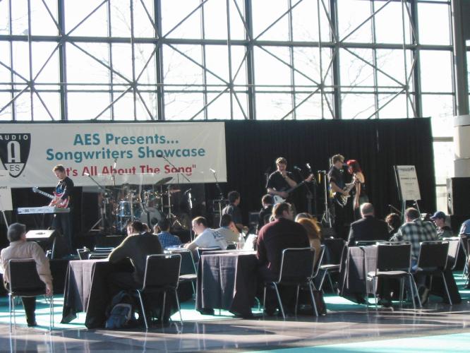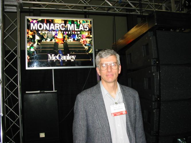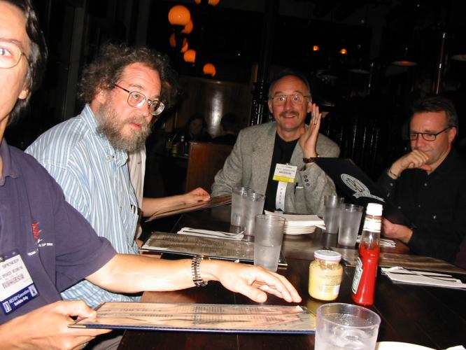 The usual suspects at the Rec.audio.pro dinner. L-R: Ted Spencer, Mike Rivers, Ty Ford, Daniel Weiss. About 75 attended, coordinated by Steve Lampen of Belden.