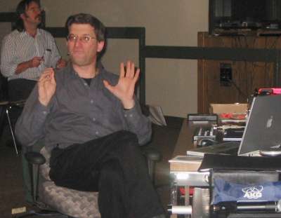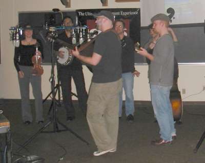 Mike Sokol makes a point while the SCC bluegrass group plays.