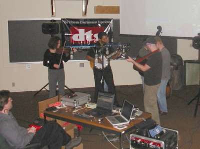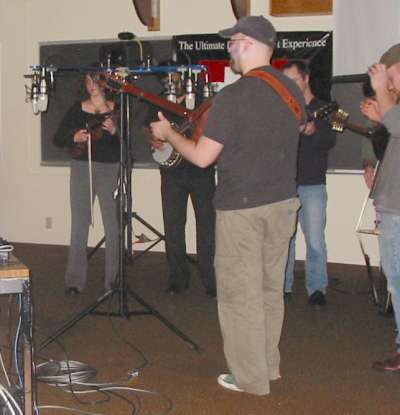 SCC bluegrass group plays for a surround recording. L-R: Tiffany Harshman, fiddle; Evan Bra-Heisner, acoustic bass; Kent Nelson and Michael Le Roche, guitars; Ethan Lawton, mandolin; and Gerrit Schimke, banjo.