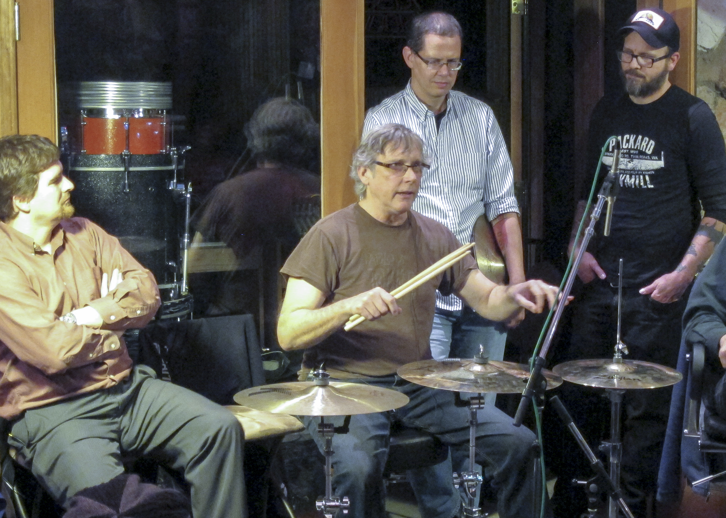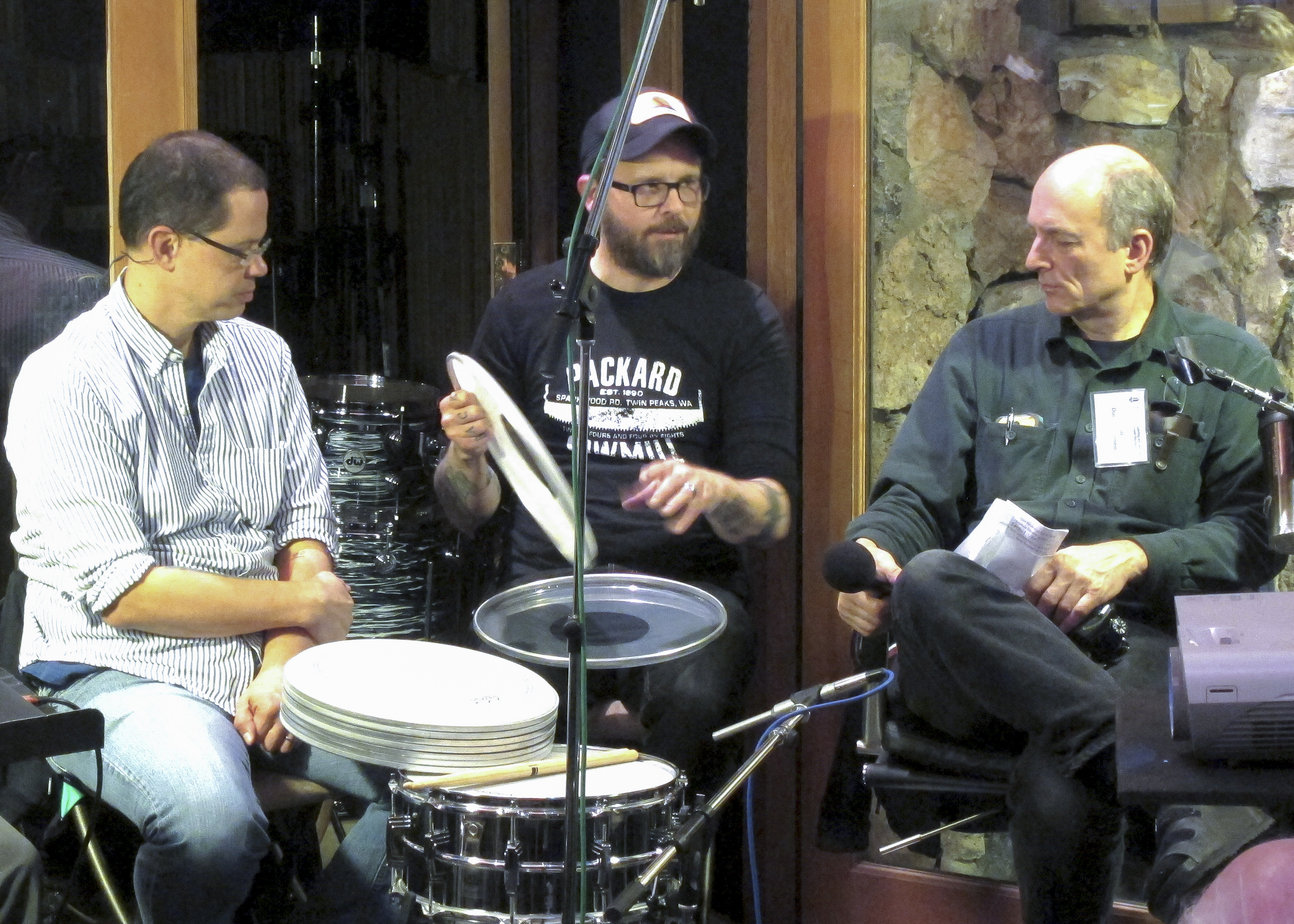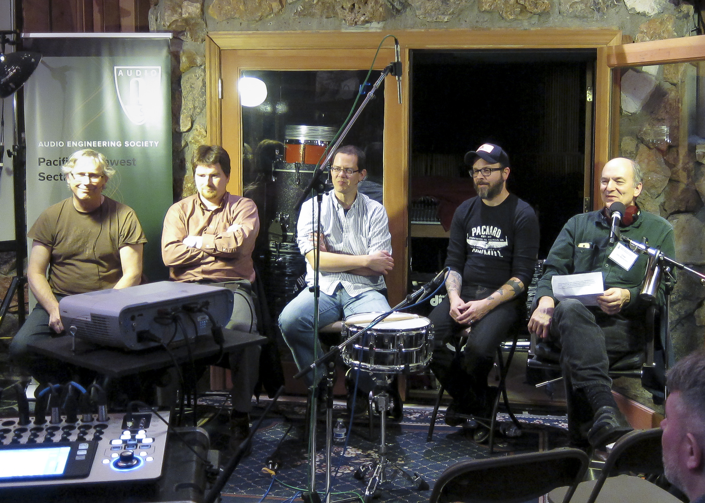 PNW Section's November 2016 meeting was held at Robert Lang Studios in Shoreline, WA, and featured a deep examination of the modern drum kit. Local experts enlisted were Dave Delozier (Assistant Manager/Lead Drum Tech, Studio Instrument Rentals (SIR) Seattle), Don Gunn (recording engineer/drummer), Steve Smith (Seattle Drum School founder, instructor, recording engineer) and Seth Tomlinson (Acoustician, the Greenbusch Group, Seattle). The event was co-produced by the AES PNW and the Robert Lang Academy Student Sections, directed by PNW Chair Dan Mortensen and Committeeperson Marlie Pesek, who is also Director of the Robert Lang Academy. A capacity crowd of 46 people attended the RSVP event, including 13 non-AES members admitted from a standby list after members.