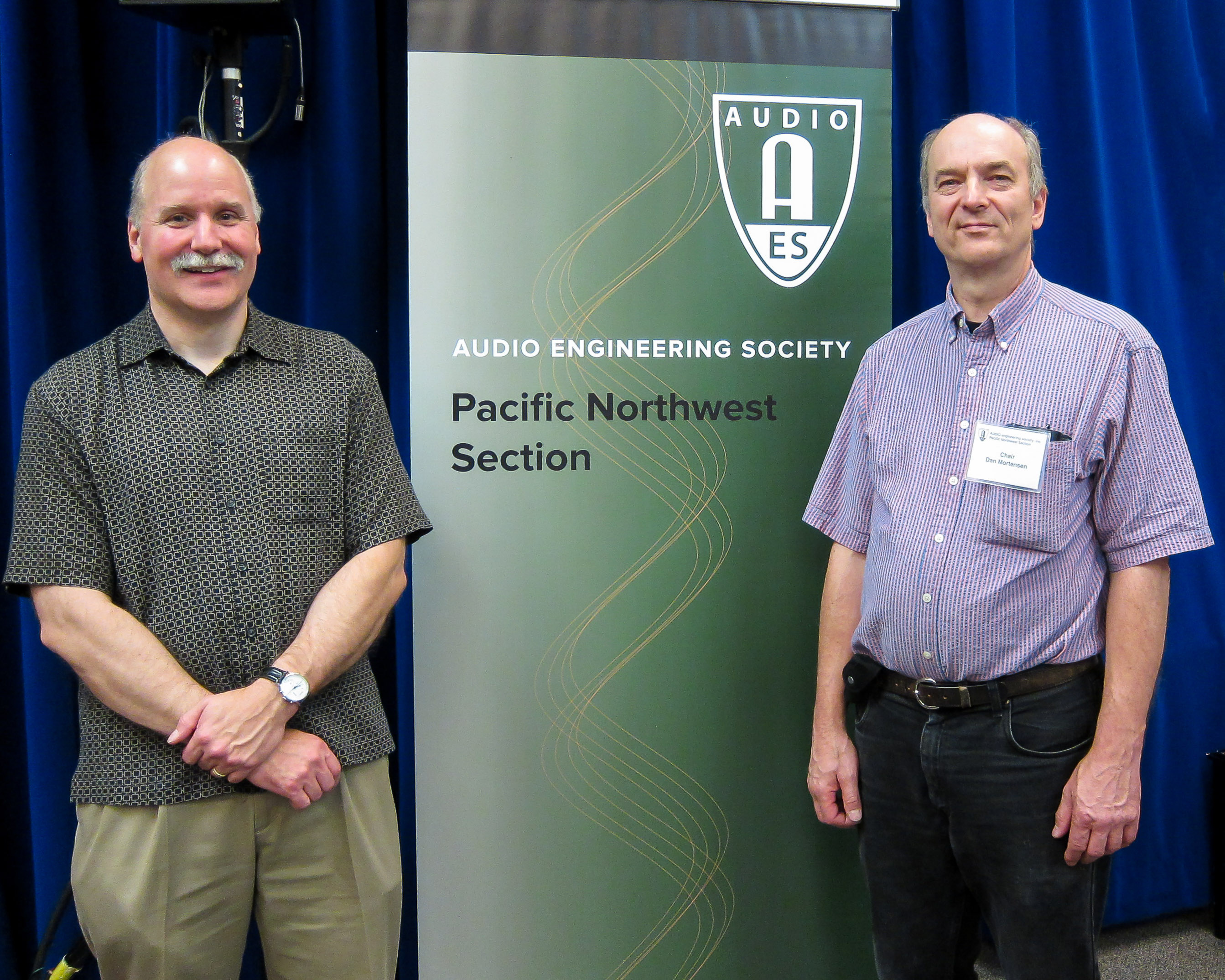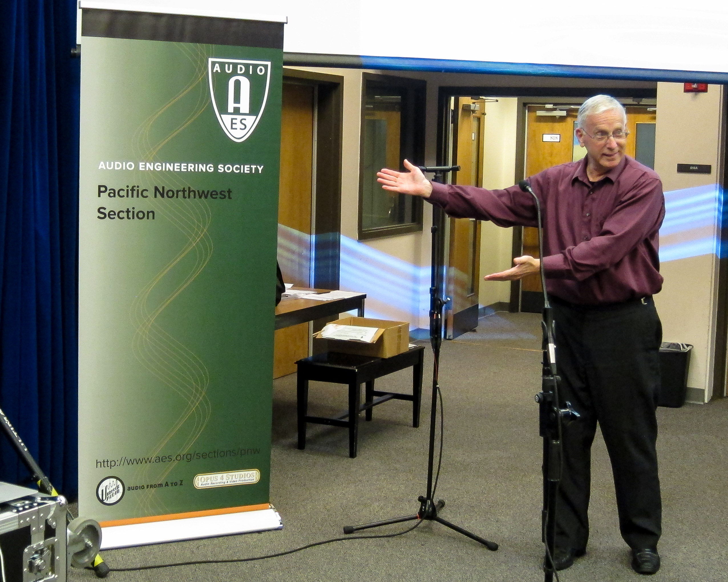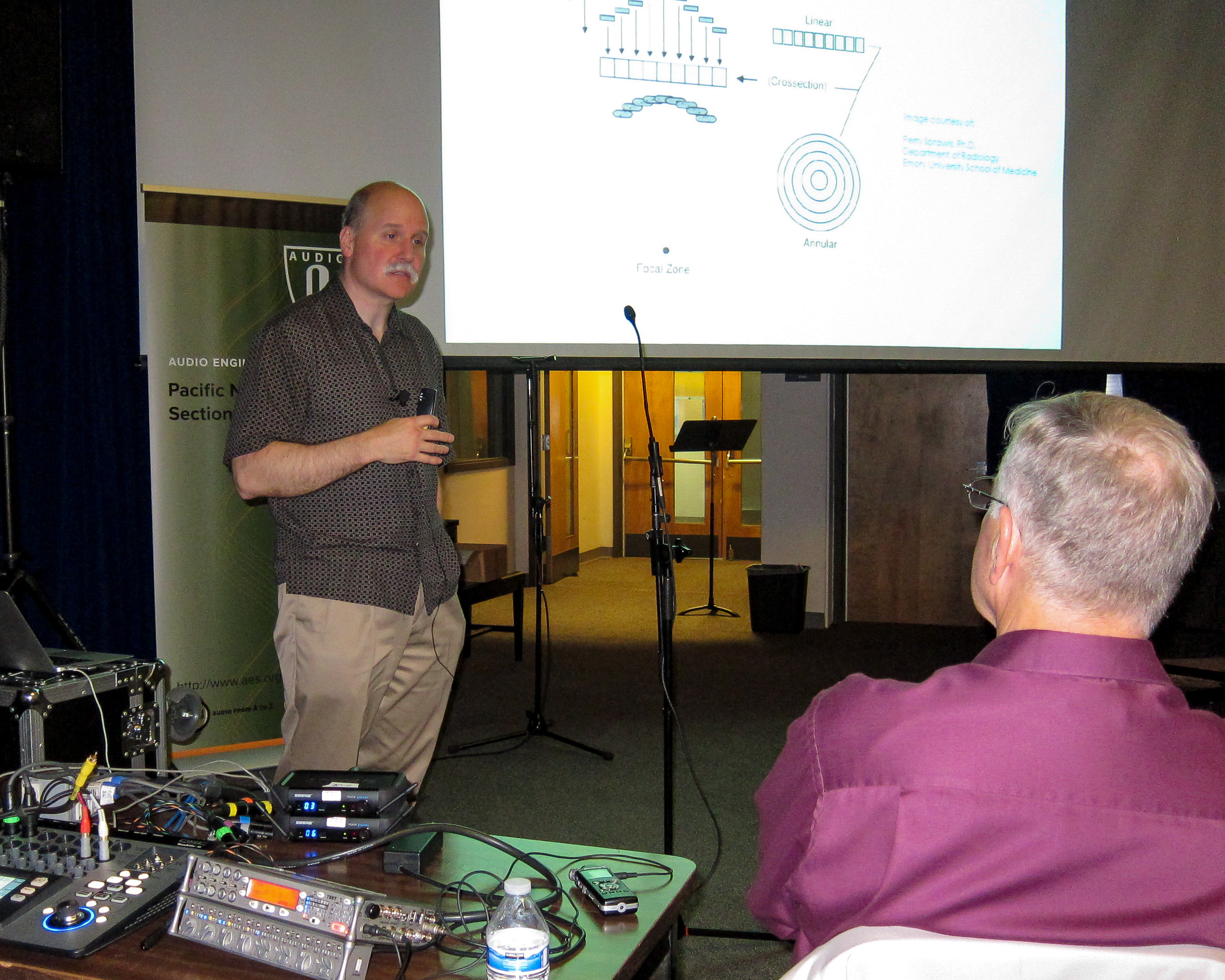 To start the evening, PNW Committee members Dr. Mike Matesky (Opus 4 Studios) and Rick Chinn (Uneeda Audio) unveiled a new AES PNW free-standing banner sign they are donating to the Section, with graphics collaborated on by the two, and with Committeeperson Lawrence Schwedler's wife, designer Randi Ganulin. Incoming Chair Dan Mortensen conducted some Section business, and introduced the guest speaker. Jens U. Quistgaard is currently President and CEO of Mirabilis Medical Inc., which is developing a non-invasive ultrasound therapy for treatment of uterine fibroids. He was formerly President and CEO of LipoSonix, Inc., a founder of SonoSite, Inc., and Chief Scientist at ATL Ultrasound (now part of Philips Medical Systems). Dr. Quistgaard holds a BS degree in Mathematics and Computational Sciences from Stanford University, and MS and PhD degrees in Electrical Engineering from the University of Washington. He is a Director of Life Science Washington, Vice Chairman of the Washington State Medical Device Innovation Partnership Zone, and a member of the Electrical Engineering Advisory Board and College of Engineering Visiting Committee at the University of Washington. Jens noted that the laws of physics for ultrasound work just like they do for longer audio wavelengths. Waves are generated, adhere to formulas for velocity and wavelength, can reflect, can be absorbed, and can be focused. Ultrasound is used at low power for diagnostic imaging, such as a fetus in the womb, and at very high power can "cook" parts of a tumor which can be absorbed by the body's natural defenses. Diagnostic imaging is pretty mature, but therapeutic uses less so. Ultrasonic generators are typically arrays of piezoelectric transducers chosen for specific uses, and the operating frequency may be adjusted as well for specific imaging needs. Jens also described beam-forming by both electronic and mechanical means, and other enhancements for diagnostic imaging. The FDA adult power limit of 720mW/cm*2 was mentioned. Jens' company is currently working on "HIFU" therapeutic uses - High Intensity Focused Ultrasound, which can use several thousand watts/cm*2 to heat portions of certain tumors non-invasively. The body's own defense mechanism removes the dead tissue. The initial work is on uterine fibroids, although he also discussed its use as an alternative to low-volume liposuction surgery. This treatment is not yet FDA approved or commercially available, and tests continue in Germany. Discussion continued with other aspects of such high power, including cavitation, localized boiling, and an effect called acoustic streaming, where fluids are caused to move.