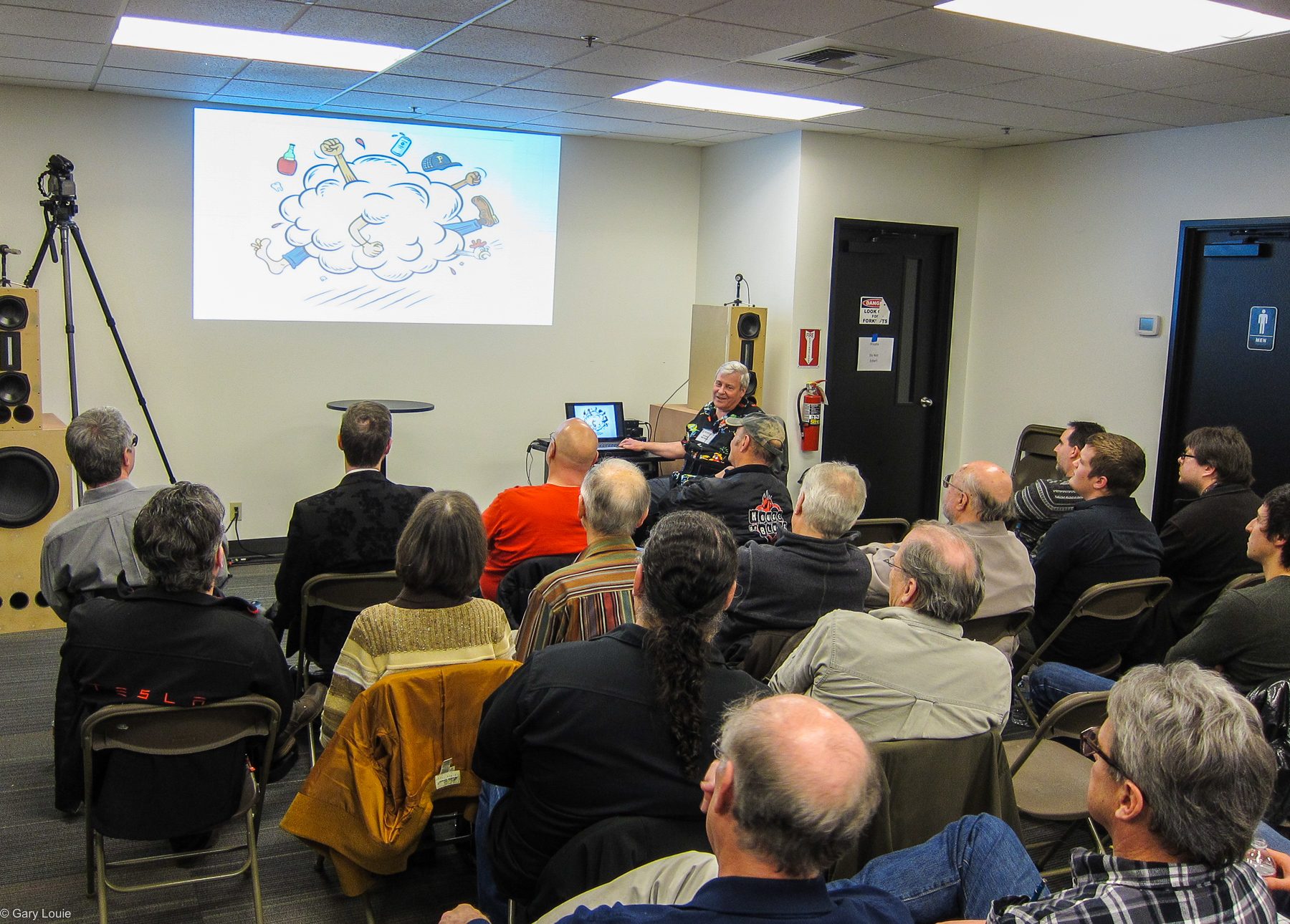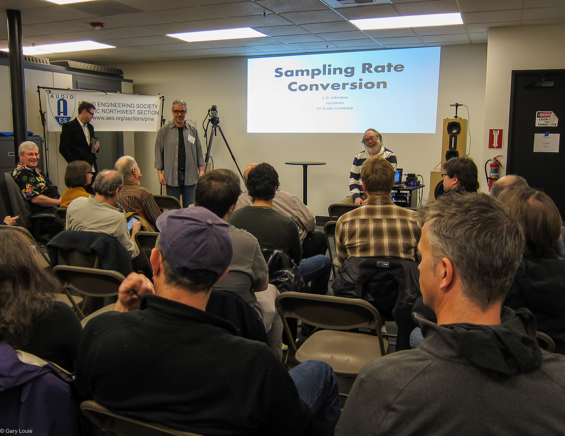 The PNW Section kicked off 2016 with a Saturday afternoon session about sampling rate conversion (SRC). AES/IEEE Fellow James D. (JJ) Johnston gave a tutorial on sampling, how sampling creates and controls the whole process, what a SRC does, how it works, and what it should and should not do. Bob Smith, of the AES PNW committee and an acoustic scientist at Physio-Control, then gave a presentation about SRC testing, with results showing aliasing and step response of different filters. Snack breaks were held about every hour. The meeting was held at a new, as-yet-to-be-named audio research company in Redmond, WA. 41 people attended, about 18 being AES members. Full A/V documentation will be available as well as the Powerpoint decks of the entire meeting.