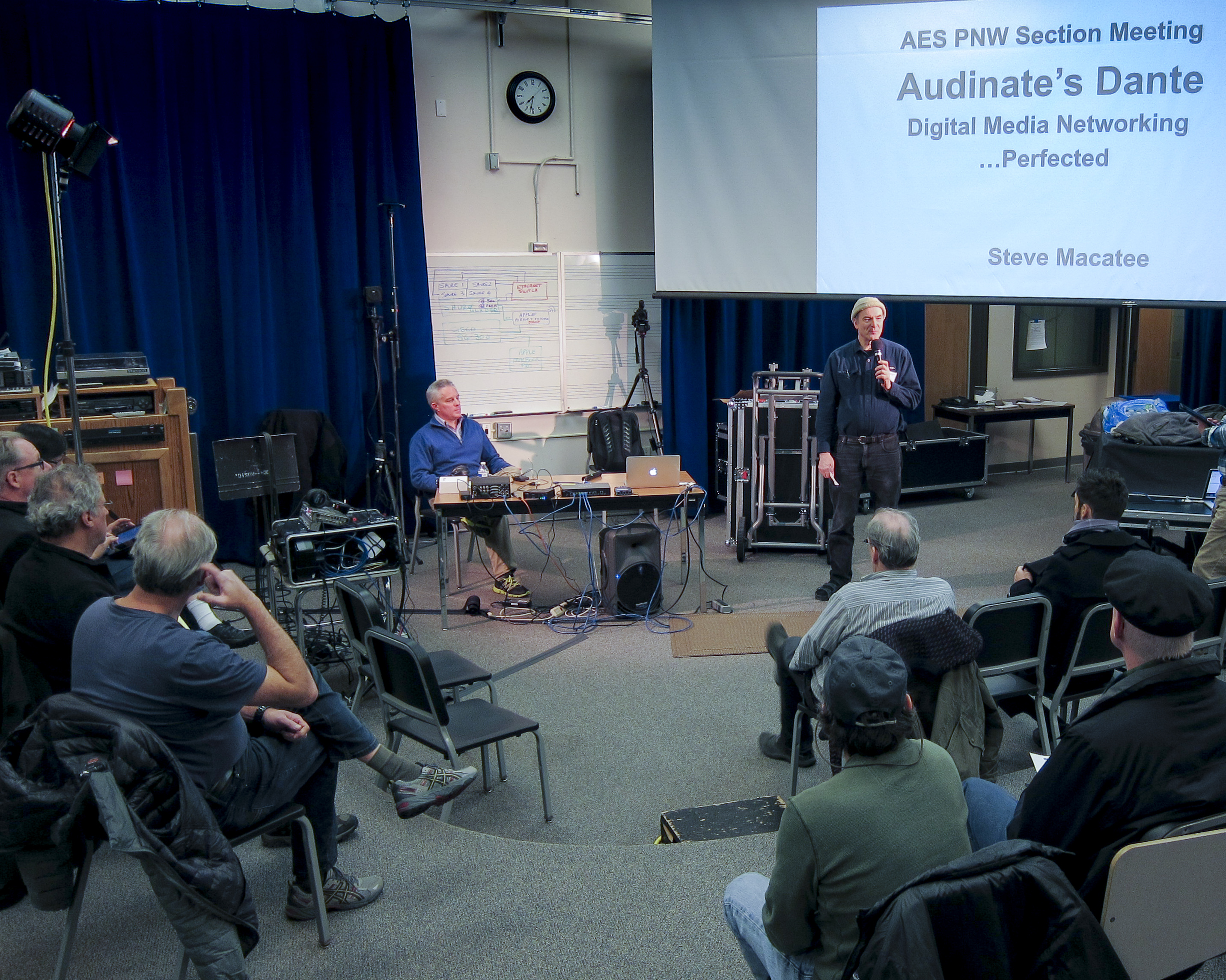 The PNW Section held a (rare!) December meeting on Dante audio network technology. PNW Committeeperson Steve Macatee, a former longtime Rane employee and a current SynAudCon instructor, conducted this introduction to Dante. About 25 persons attended (15 AES members) the meeting at Shoreline Community College in Shoreline, WA.