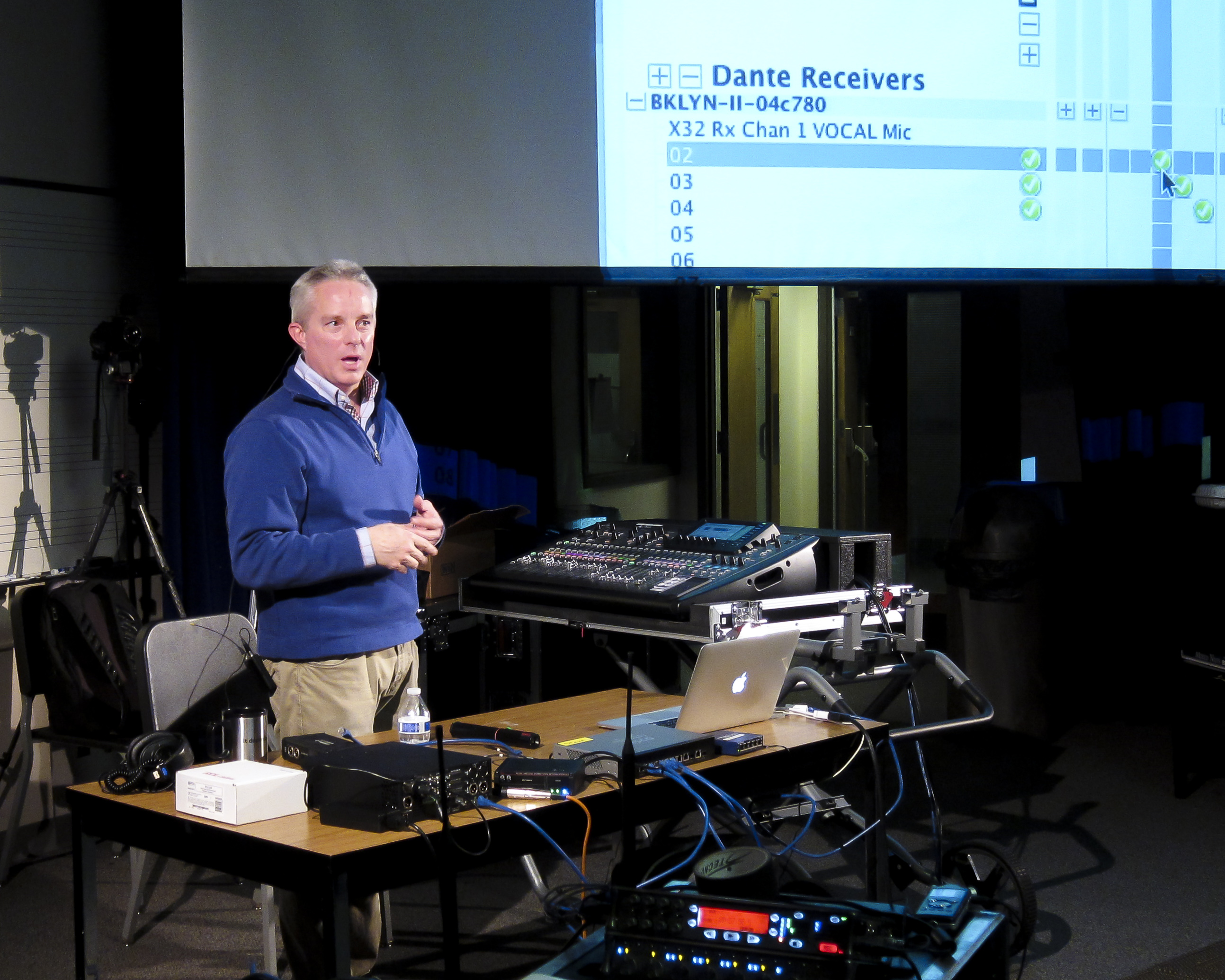 Continuing with the presentation, Macatee spoke about the OSI (Open Systems Interconnection) Model and how it applies to IP (Internet Protocol) networks & IT folks in corporate and converged networks. He described how Dante is designed to work without hiccups of any kind with other IP traffic. In small and medium-sized dedicated audio-only networks, no QoS (Quality of Service) is generally needed in the network infrastructure devices. But QoS-enabled Ethernet switches are highly recommended and easily configured in very cost-effective managed switches when you have large channel counts, complex audio routing or when sharing audio and network data in the same infrastructure.