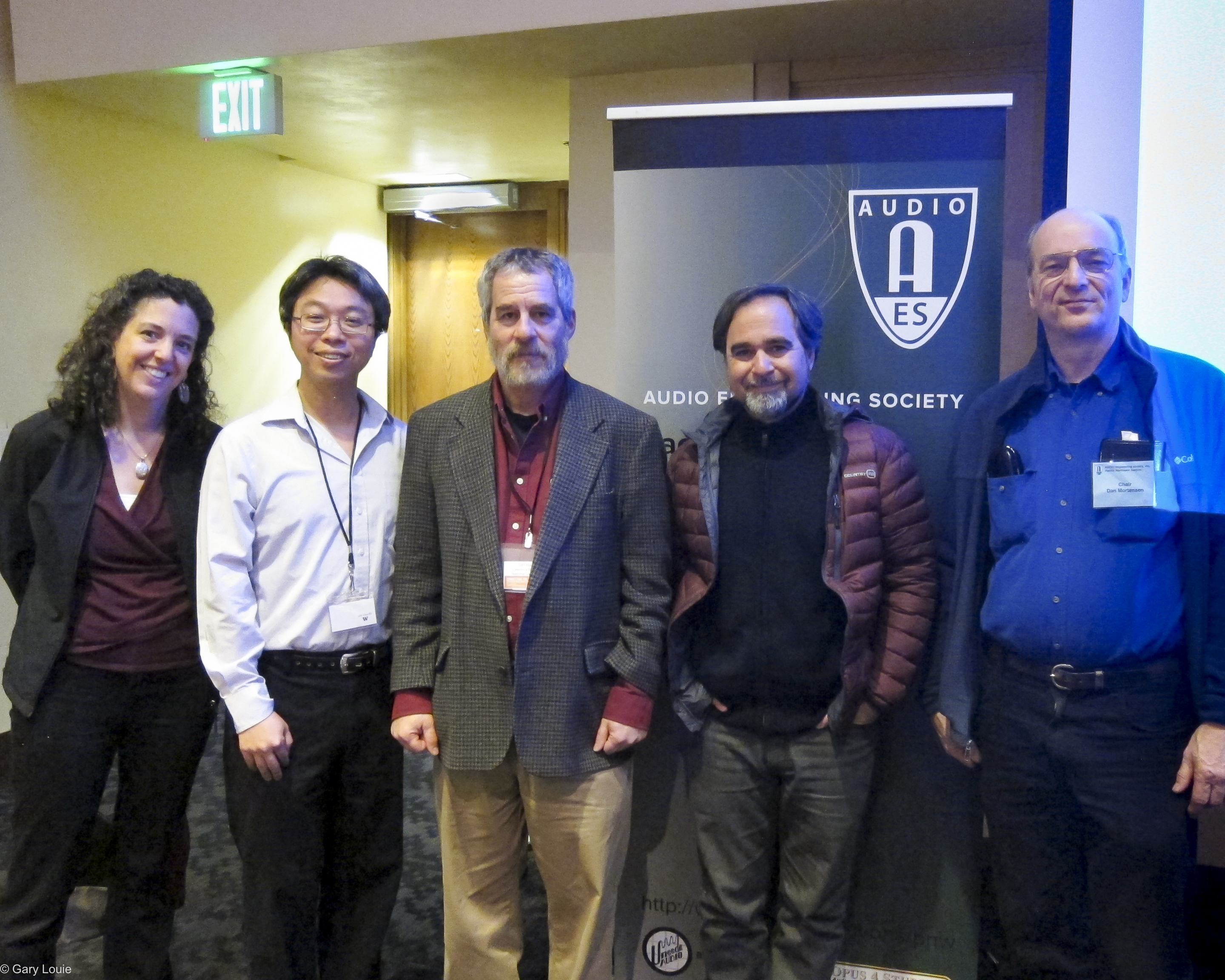 Dr. Kathryn Bunn-Marcuse, Curator, Northwest Native Art at the Burke Museum, Prof. Shih-Chieh Hsu, UW Physics, Dr. Carl Haber, Lawrence Berkeley Lab, Prof. Juan Pampin, UW DXARTS, Dan Mortensen, AES PNW Section Chair.