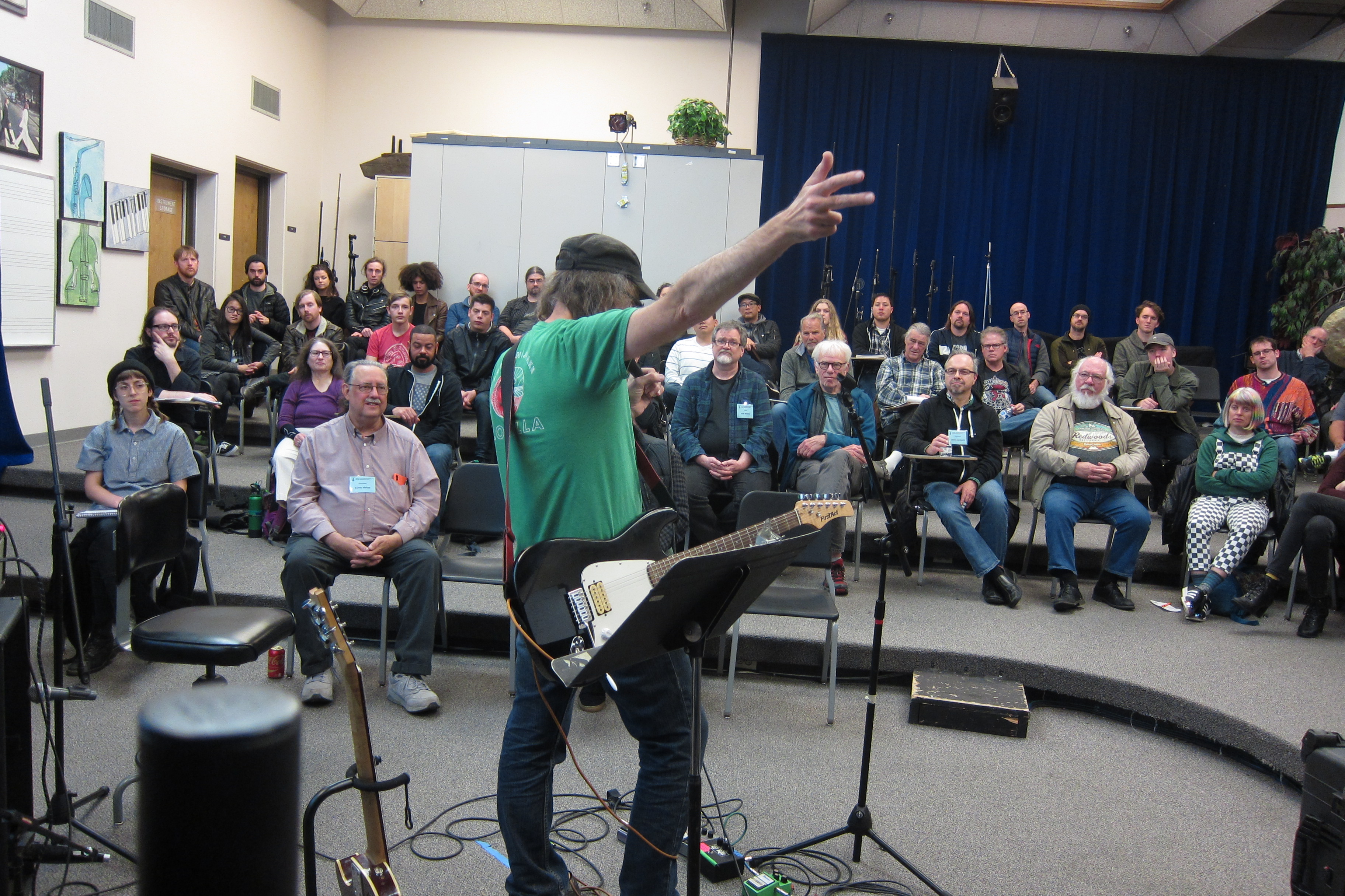 Jack Endino is a Seattle record producer, recording engineer, mixer, and musician with somewhere over 500 records to his credit, including bands like Nirvana, Mudhoney, and Soundgarden. He earned his BSEE from the University of Washington in 1980, and was recording in earnest by 1986. (Our last meeting with Jack was in 2006) Jack's original "rant-style" interview about problems in the studio due to guitar tuning problems showed up in TapeOp Magazine in 2002 (and can also be seen on Jack's website, with addenda, here). This evening was not just about tuning, but a huge list of caveats, tips and tricks to remember when dealing with modern guitars in the recording studio. Jack had his vintage Fender guitar amp, speaker stack, effects pedal array, and a couple of his guitars to demonstrate. Beginning with general tuning differences caused by music style and picking style, he also covered many details about tuning aids and what works and what doesn't. Electric guitar construction, pickups and effects pedals and their problems were discussed at length. Jack also talked about guitar amplifiers - tube/solid state, the raw speakers in the cabinets, polarity of inputs and speakers and different mic placements for different speaker cabinets. After a refreshment break, door prizes were awarded to: