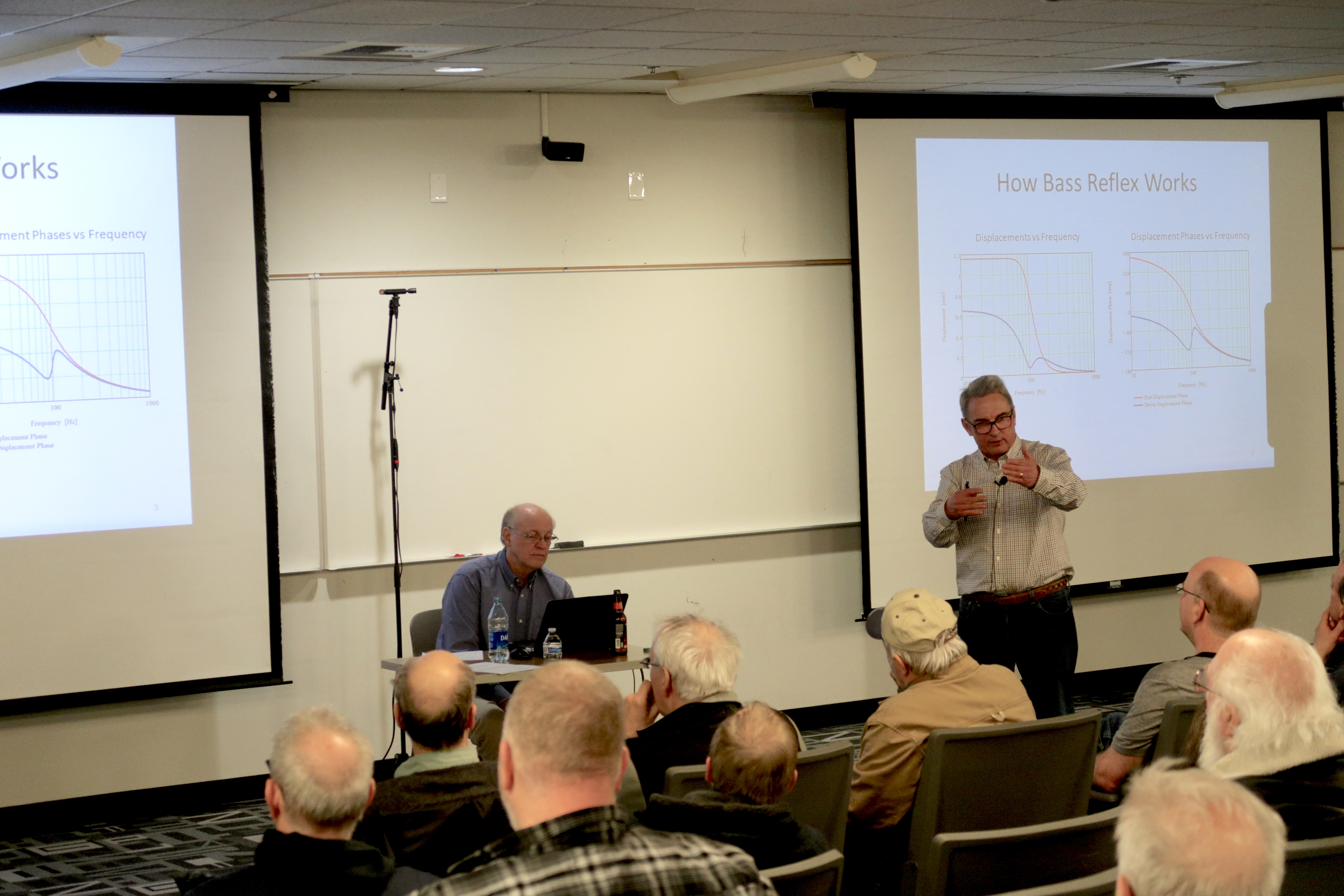 Gary Gesellchen is a Mechanical Engineer who built his first pair of custom speakers while still in high school. He launched his own speaker company, Vanatoo, with Rick Kernen after a 25 year career in design, manufacturing, and management with electromechanical computer peripherals makers (disk drives and printers). His presentation this evening focused on the bass reflex design process. He explained the bass reflex characteristics, and showed how one might take all the desired parameters to arrive at a viable design. In the end, a passive radiator can be a better choice than a port. Building on the well-known work of Thiele and Small, which standardized the mathematical model of speaker design, Gesellchen uses some modeling methods that make it easier to run on ordinary spreadsheet programs. He reiterated that the models are for small signal and not so good for large excursions. He also likes the 4th order Butterworth high-pass alignment for a variety of reasons. When the maximum SPL and desired low frequency response is identified, the port and driver size can be found. Further modeling with box size and power requirements allows homing in on a design. He cited vintage work on power requirements from Josef Hofmann of KLH, whose "Iron Law" predicted speaker power requirements. Vanatoo's current flagship product went with a passive radiator to get the box size down. Gary provided all of his design process in a White Paper (see link above), as well as the following Excel spreadsheets for all to try. General Purpose Ported T-S Loudspeaker Model Spreadsheet