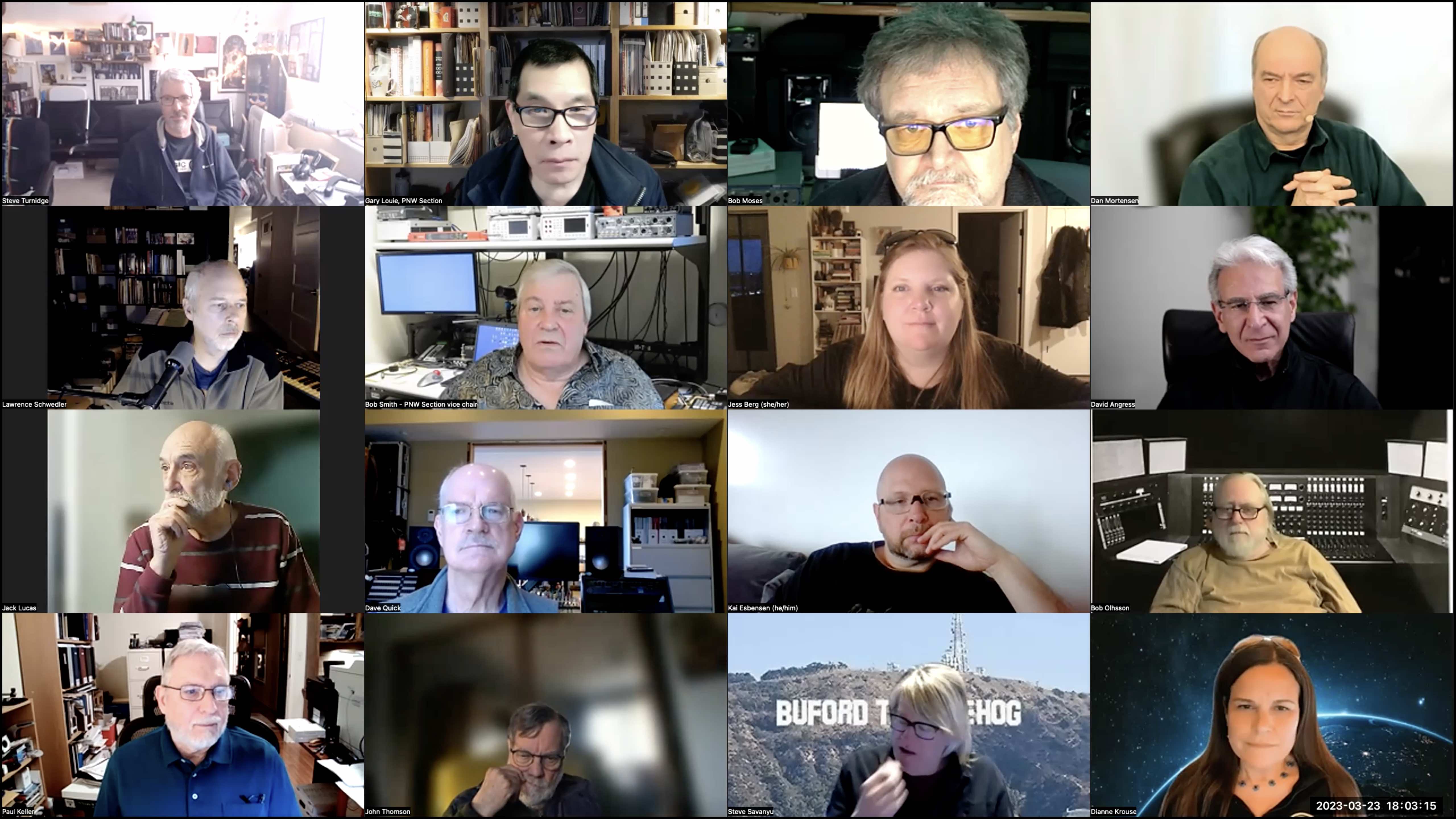 The PNW Section's March 2023 meeting was held via Zoom, and discussed how technology is evolving to allow legitimate personal music streaming, with proper credit, and not be in the control of a few major companies. About 26 AES members attended and 11 non-members. Leading the discussion were PNW mastering engineer Steve Turnidge as our host, Jam Galaxy founder Dianne Krouse, and former AES Executive Director Bob Moses.